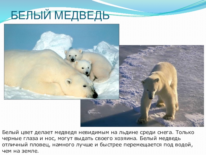 БЕЛЫЙ МЕДВЕДЬБелый цвет делает медведя невидимым на льдине среди снега. Только черные глаза и нос, могут выдать