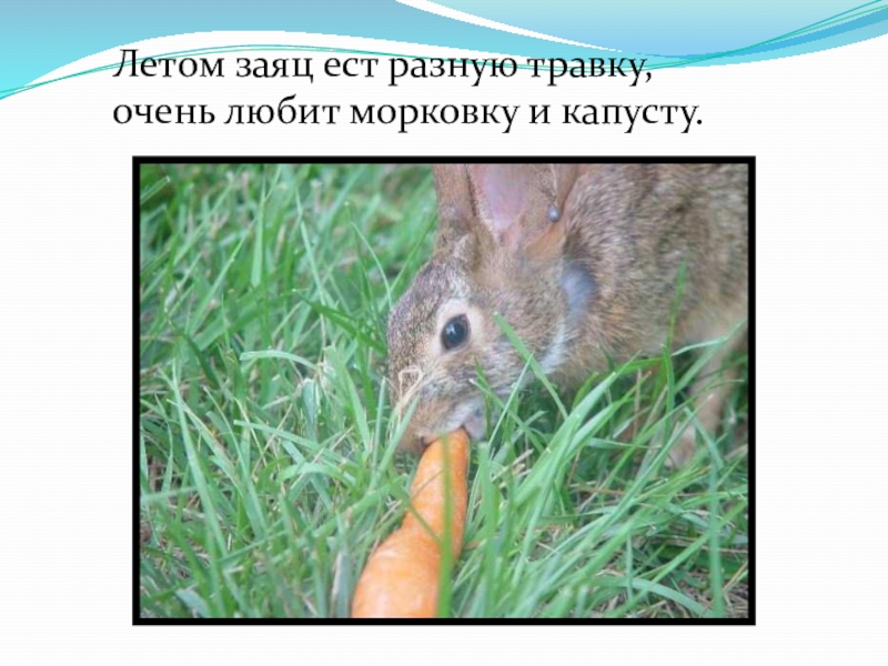 Слайд 6Летом заяц ест разную травку, очень любит морковку и капусту.