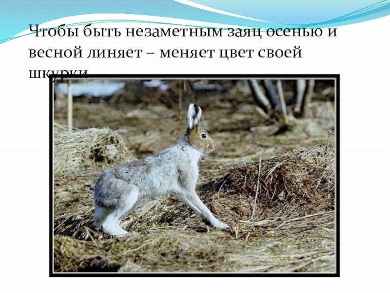 Слайд 10Чтобы быть незаметным заяц осенью и весной линяет – меняет цвет