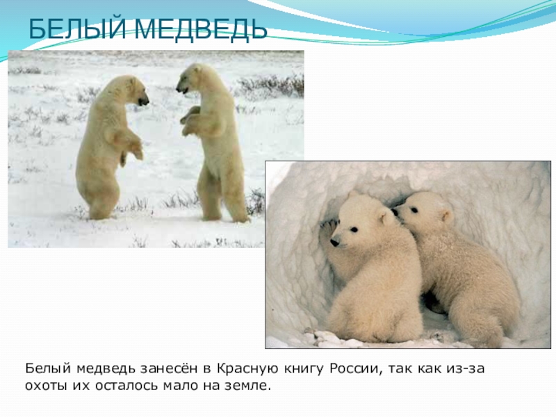 БЕЛЫЙ МЕДВЕДЬБелый медведь занесён в Красную книгу России, так как из-за охоты их осталось мало на земле.