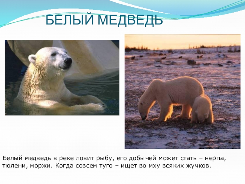 БЕЛЫЙ МЕДВЕДЬБелый медведь в реке ловит рыбу, его добычей может стать – нерпа, тюлени, моржи. Когда совсем