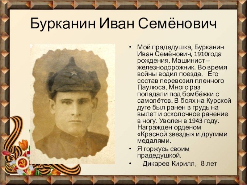 Мой прадедушка, Бурканин Иван Семёнович, 1910года рождения. Машинист –