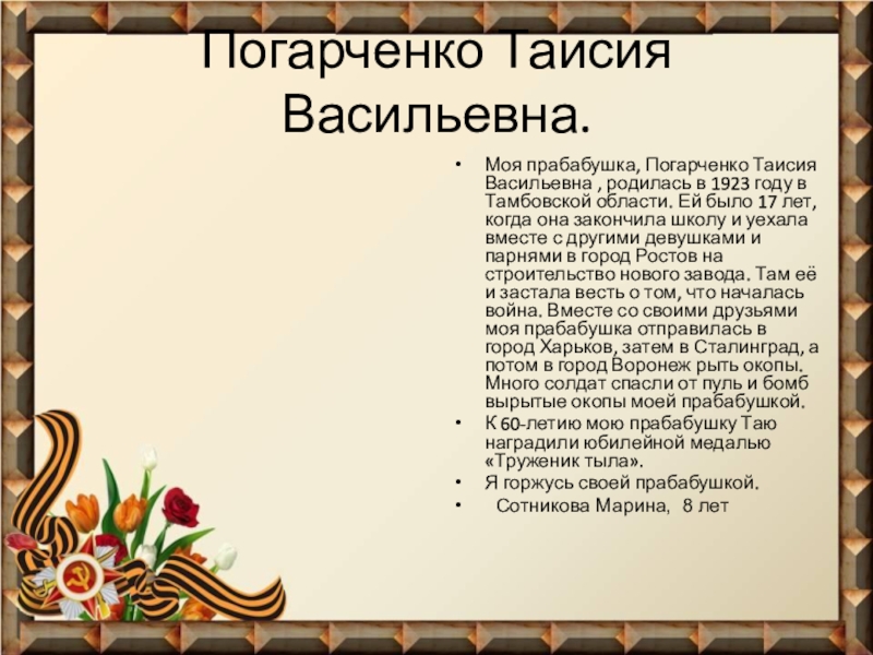 году в Тамбовской области. Ей было 17 лет, когда она закончила школу и уехала вместе с другими девушками и парнями в город Ростов на строительство нового завода. Там её и застала весть о том, что началась война. Вместе со своими друзьями моя прабабушка отправилась в город Харьков, затем в Сталинград, а потом в город Воронеж рыть окопы. Много солдат спасли от пуль и бомб вырытые окопы моей прабабушкой.