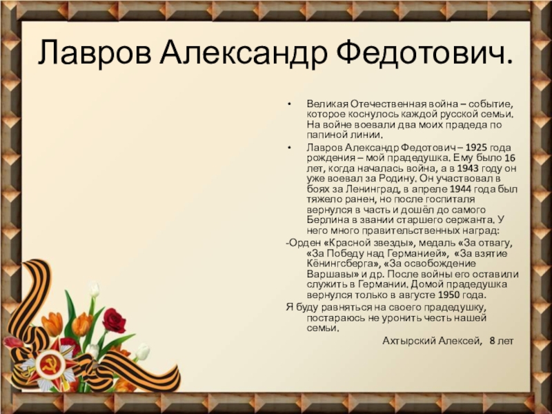 Лавров Александр Федотович – 1925 года рождения – мой прадедушка. Ему было 16 лет, когда началась война, а в 1943 году он уже воевал за Родину. Он участвовал в боях за Ленинград, в апреле 1944 года был тяжело ранен, но после госпиталя вернулся в часть и дошёл до самого Берлина в звании старшего сержанта. У него много правительственных наград: