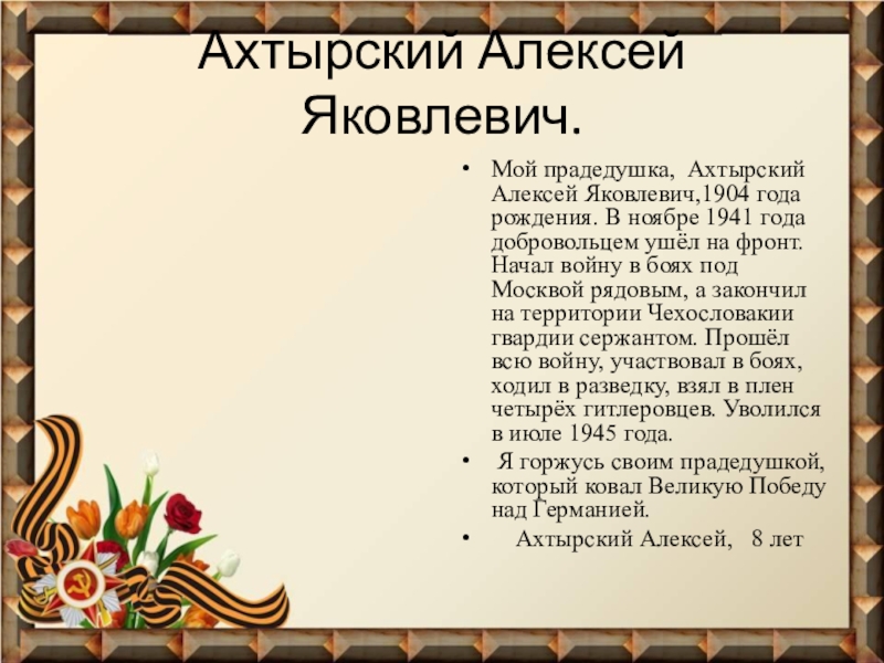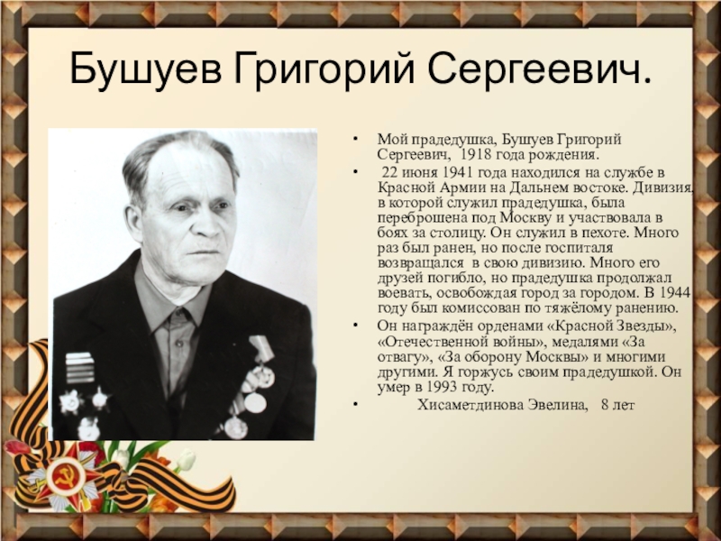 19 лет он ушёл на войну, воевал за Москву, Сталинград, освобождал Польшу, дошёл до Берлина. Много раз был ранен. В 1944 году его родным пришла похоронка, но дедушка остался жив, он больше суток пролежал без сознания с мёртвыми. После госпиталя вернулся в свою часть, продолжал воевать и дошёл до Берлина. У него много наград: ордена: Красной Звезды, Отечественной войны 1941-45гг., медали – за Оборону Москвы, за взятие Берлина и много других. В 1945 году он вернулся домой и прожил до 2009 года. Я горжусь своим прадедушкой.