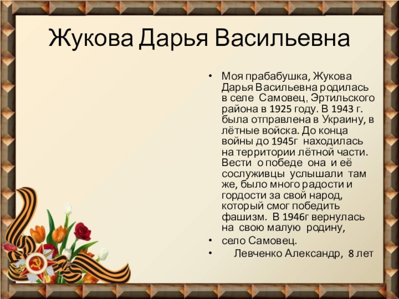 Моя прабабушка, Жукова Дарья Васильевна родилась в селе Самовец,
