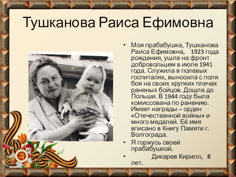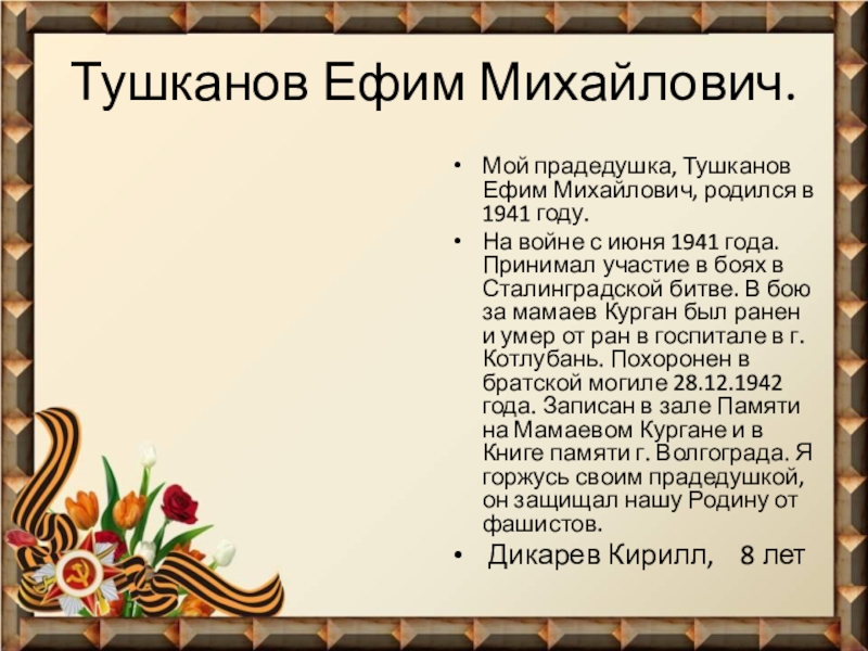 Мой прадедушка, Тушканов Ефим Михайлович, родился в 1941 году.