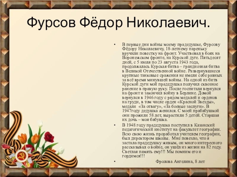 18-летнему пареньку вручили повестку на фронт. Участвовал в боях на Воронежском фронте, на Курской дуге. Пятьдесят дней, с 5 июля по 23 августа 1943 года, продолжалась Курская битва – грандиозная битва в Великой Отечественной войне. Развернувшиеся крупные танковые сражения не имели себе равных за всё время минувшей войны. На одной из битв Курской дуги мой прадедушка получил сквозное ранение в правую руку. После госпиталя вернулся на фронт и закончил войну в Берлине. Домой вернулся в 1946 году с рядом медалей и орденов на груди, в том числе орден «Красной Звезды», медали «За отвагу», «За боевые заслуги». В 1947году дедушка женился. С моей прабабушкой они прожили 58 лет, вырастили 5 детей. Старшая их дочь – моя бабушка.