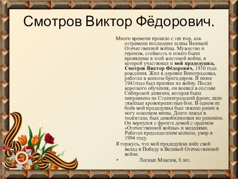 залпы Великой Отечественной войны. Мужество и героизм, стойкость и отвага были проявлены в этой жестокой войне, в которой участвовал и мой прадедушка, Смотров Виктор Фёдорович, 1910 года рождения. Жил в деревне Виноградовка, работал в колхозе бригадиром. В июне 1941года был призван на войну. После короткого обучения, он воевал в составе Сибирской дивизии, которая была направлена на Сталинградский фронт, шли тяжёлые кровопролитные бои. В одном из боёв мой прадедушка был тяжело ранен в ногу осколком мины. Долго лежал в госпитале, был демобилизован по ранению. Он вернулся с фронта домой с орденом «Отечественной войны» и медалями. Работал председателем колхоза, умер в 1994 году.