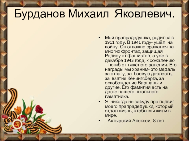 году- ушёл на войну. Он отважно сражался на многих фронтах, защищая Родину от фашистов. а уже в декабре 1943 года, к сожалению – погиб от тяжёлого ранения. Его награды мы храним- это медаль за отвагу, за боевую доблесть, за взятие Кёнингсберга, за освобождение Варшавы и другие. Его фамилия есть на доске нашего школьного памятника.