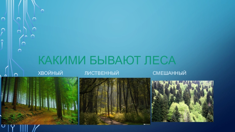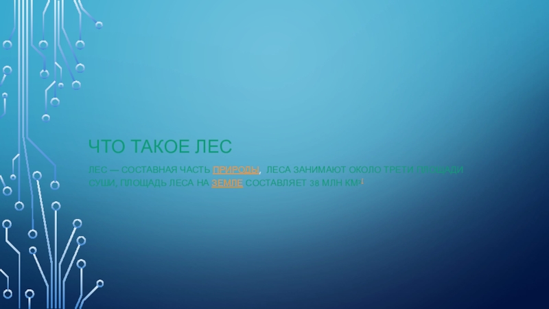 Что такое лесЛес — составная часть природы,  Леса занимают около трети площади суши, площадь леса на Земле составляет 38 млн км²[