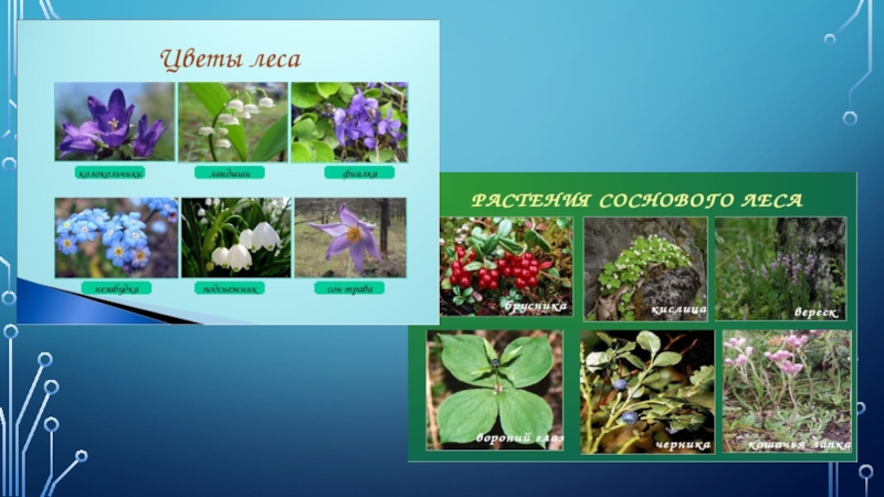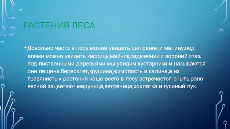 Растения лесаДовольно часто в лесу можно увидеть шиповник и малину.под елями можно увидеть кислицу,майник,седмичник и вороний глаз.под