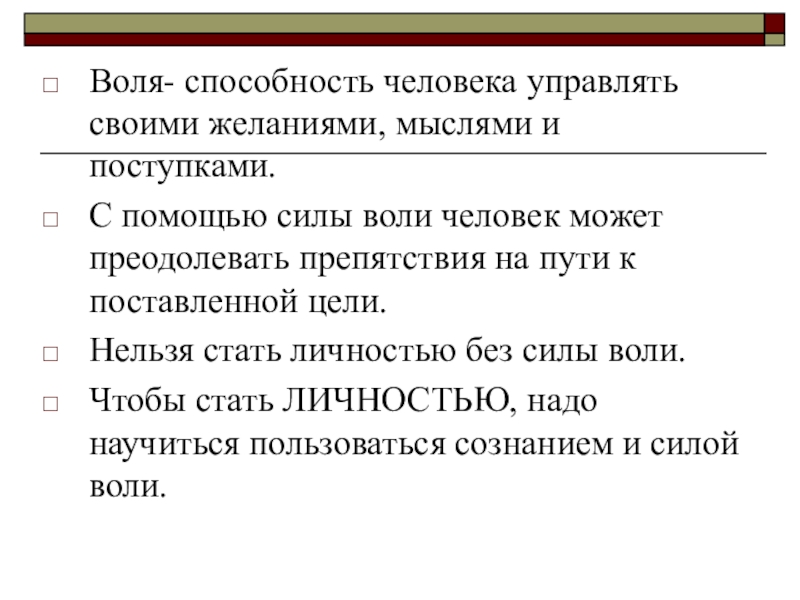 Воля- способность человека управлять своими желаниями, мыслями и поступками.С помощью силы воли человек может преодолевать препятствия на пути к поставленной цели.Нельзя стать личностью без силы воли.Чтобы стать ЛИЧНОСТЬЮ, надо научиться пользоваться сознанием и силой воли.