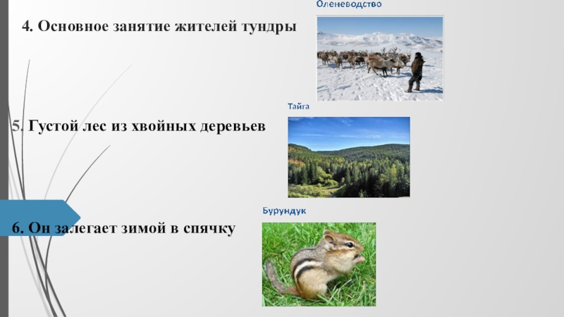 4. Основное занятие жителей тундры  5. Густой лес из хвойных деревьев6. Он залегает зимой в спячку