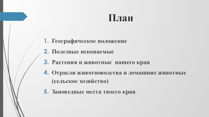 План Географическое положениеПолезные ископаемыеРастения и животные нашего краяОтрасли животноводства и домашние животные (сельское хозяйство)Заповедные места твоего края