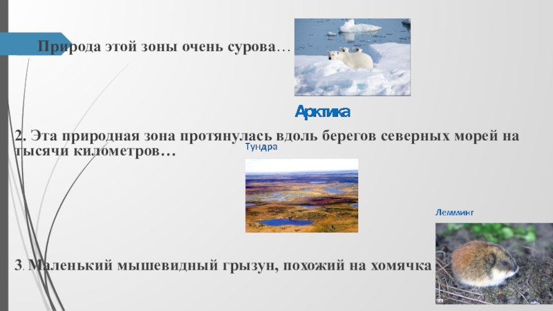 Природа этой зоны очень сурова…  2. Эта природная зона протянулась вдоль берегов северных морей на тысячи