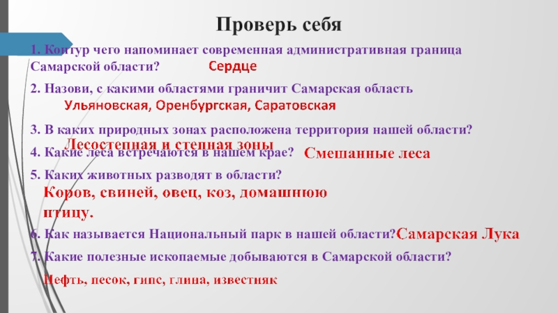 Проверь себя1. Контур чего напоминает современная административная граница Самарской области?2. Назови, с какими областями граничит Самарская область3.