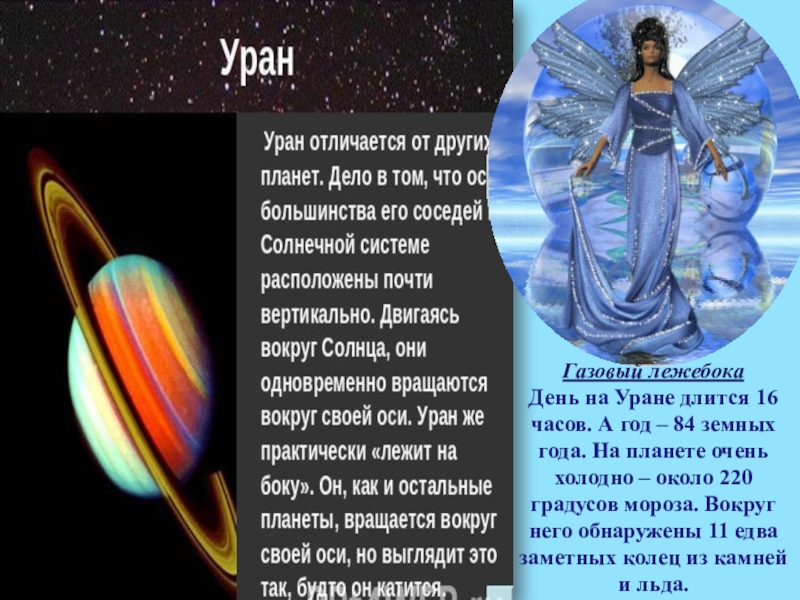 Газовый лежебока День на Уране длится 16 часов. А год – 84 земных года. На планете очень