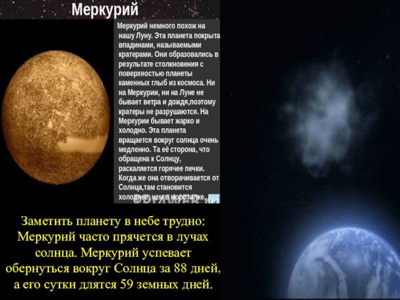 Заметить планету в небе трудно: Меркурий часто прячется в лучах солнца. Меркурий успевает обернуться вокруг Солнца за