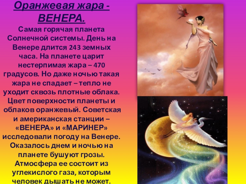 длится 243 земных часа. На планете царит нестерпимая жара – 470 градусов. Но даже ночью такая жара не спадает – тепло не уходит сквозь плотные облака. Цвет поверхности планеты и облаков оранжевый. Советская и американская станции – «ВЕНЕРА» и «МАРИНЕР» исследовали погоду на Венере. Оказалось днем и ночью на планете бушуют грозы. Атмосфера ее состоит из углекислого газа, которым человек дышать не может.