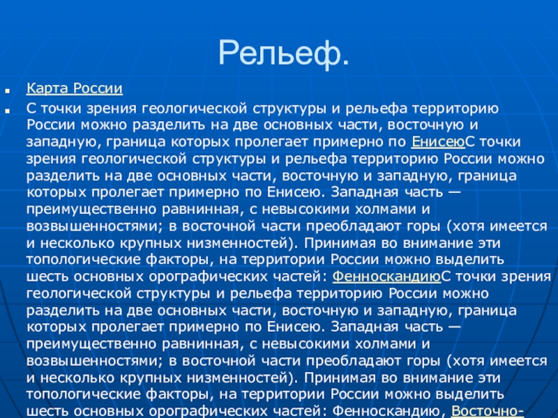 разделить на две основных части, восточную и западную, граница которых пролегает примерно по ЕнисеюС точки зрения геологической структуры и рельефа территорию России можно разделить на две основных части, восточную и западную, граница которых пролегает примерно по Енисею. Западная часть — преимущественно равнинная, с невысокими холмами и возвышенностями; в восточной части преобладают горы (хотя имеется и несколько крупных низменностей). Принимая во внимание эти топологические факторы, на территории России можно выделить шесть основных орографических частей: ФенноскандиюС точки зрения геологической структуры и рельефа территорию России можно разделить на две основных части, восточную и западную, граница которых пролегает примерно по Енисею. Западная часть — преимущественно равнинная, с невысокими холмами и возвышенностями; в восточной части преобладают горы (хотя имеется и несколько крупных низменностей). Принимая во внимание эти топологические факторы, на территории России можно выделить шесть основных орографических частей: Фенноскандию, Восточно-Европейскую равнинуС точки зрения геологической структуры и рельефа территорию России можно разделить на две основных части, восточную и западную, граница которых пролегает примерно по Енисею. Западная часть — преимущественно равнинная, с невысокими холмами и возвышенностями; в восточной части преобладают горы (хотя имеется и несколько крупных низменностей). Принимая во внимание эти топологические факторы, на территории России можно выделить шесть основных орографических частей: Фенноскандию, Восточно-Европейскую равнину, Уральские горыС точки зрения геологической структуры и рельефа территорию России можно разделить на две основных части, восточную и западную, граница которых пролегает примерно по Енисею. Западная часть — преимущественно равнинная, с невысокими холмами и возвышенностями; в восточной части преобладают горы (хотя имеется и несколько крупных низменностей). Принимая во внимание эти топологические факторы, на территории России можно выделить шесть основных орографических частей: Фенноскандию, Восточно-Европейскую равнину, Уральские горы, Западно-Сибирскую равнинуС точки зрения геологической структуры и рельефа территорию России можно разделить на две основных части, восточную и западную, граница которых пролегает примерно по Енисею. Западная часть — преимущественно равнинная, с невысокими холмами и возвышенностями; в восточной части преобладают горы (хотя имеется и несколько крупных низменностей). Принимая во внимание эти топологические факторы, на территории России можно выделить шесть основных орографических частей: Фенноскандию, Восточно-Европейскую равнину, Уральские горы, Западно-Сибирскую равнину, Среднесибирское плоскогорье, горы юга и востока России.