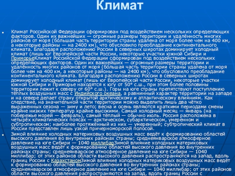 важнейших — огромные размеры территории и удалённость многих районов от моря (бо́льшая часть территории страны удалена от моря более чем на 400 км, а некоторые районы — на 2400 км), что обусловило преобладание континентального климата. Благодаря расположению России в северных широтах доминирует холодный климат (лишь юг Европейской части России, некоторые участки южной Сибири и ПриморьеКлимат Российской Федерации сформирован под воздействием нескольких определяющих факторов. Один их важнейших — огромные размеры территории и удалённость многих районов от моря (бо́льшая часть территории страны удалена от моря более чем на 400 км, а некоторые районы — на 2400 км), что обусловило преобладание континентального климата. Благодаря расположению России в северных широтах доминирует холодный климат (лишь юг Европейской части России, некоторые участки южной Сибири и Приморье находятся к югу от 50° с.ш., при этом более половины территории лежит к северу от 60° с.ш.). Горы на юге страны препятствуют поступлению тёплых воздушных масс с Индийского океана, а равнинный характер территории на западе и на севере делает страну открытой арктическому и атлантическому влияниям. Как следствие, на значительной части территории можно выделить лишь два чётко выраженных сезона — зиму и лето; весна и осень являются краткими периодами смены крайне низких температур крайне высокими. Самый холодный месяц — январь (на побережье морей — февраль), самый тёплый — обычно июль. Россия расположена в четырёх климатических поясах — арктическом, субарктическом, умеренном и субтропическом; наиболее протяжённый из них — умеренный; субтропический климат в России представлен лишь узкой причерноморской полосой.