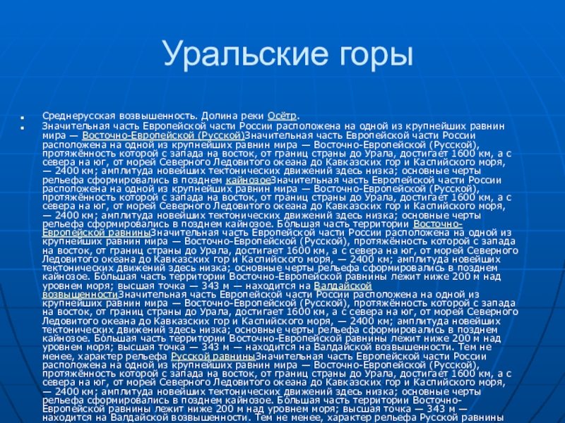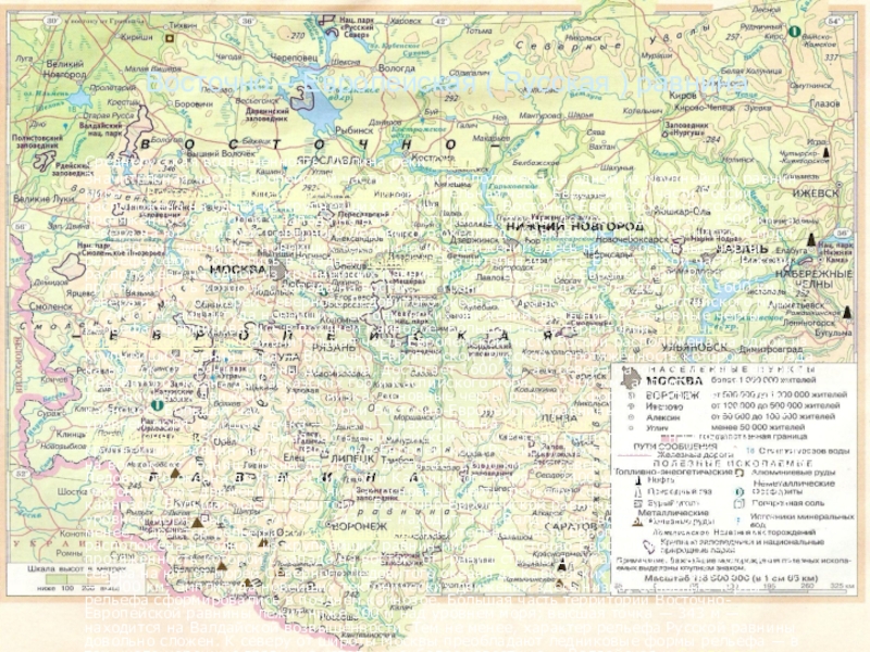 Значительная часть Европейской части России расположена на одной из крупнейших равнин мира — Восточно-Европейской (Русской)Значительная часть Европейской части России расположена на одной из крупнейших равнин мира — Восточно-Европейской (Русской), протяжённость которой с запада на восток, от границ страны до Урала, достигает 1600 км, а с севера на юг, от морей Северного Ледовитого океана до Кавказских гор и Каспийского моря, — 2400 км; амплитуда новейших тектонических движений здесь низка; основные черты рельефа сформировались в позднем кайнозоеЗначительная часть Европейской части России расположена на одной из крупнейших равнин мира — Восточно-Европейской (Русской), протяжённость которой с запада на восток, от границ страны до Урала, достигает 1600 км, а с севера на юг, от морей Северного Ледовитого океана до Кавказских гор и Каспийского моря, — 2400 км; амплитуда новейших тектонических движений здесь низка; основные черты рельефа сформировались в позднем кайнозое. Бо́льшая часть территории Восточно-Европейской равниныЗначительная часть Европейской части России расположена на одной из крупнейших равнин мира — Восточно-Европейской (Русской), протяжённость которой с запада на восток, от границ страны до Урала, достигает 1600 км, а с севера на юг, от морей Северного Ледовитого океана до Кавказских гор и Каспийского моря, — 2400 км; амплитуда новейших тектонических движений здесь низка; основные черты рельефа сформировались в позднем кайнозое. Бо́льшая часть территории Восточно-Европейской равнины лежит ниже 200 м над уровнем моря; высшая точка — 343 м — находится на Валдайской возвышенностиЗначительная часть Европейской части России расположена на одной из крупнейших равнин мира — Восточно-Европейской (Русской), протяжённость которой с запада на восток, от границ страны до Урала, достигает 1600 км, а с севера на юг, от морей Северного Ледовитого океана до Кавказских гор и Каспийского моря, — 2400 км; амплитуда новейших тектонических движений здесь низка; основные черты рельефа сформировались в позднем кайнозое. Бо́льшая часть территории Восточно-Европейской равнины лежит ниже 200 м над уровнем моря; высшая точка — 343 м — находится на Валдайской возвышенности. Тем не менее, характер рельефа Русской равниныЗначительная часть Европейской части России расположена на одной из крупнейших равнин мира — Восточно-Европейской (Русской), протяжённость которой с запада на восток, от границ страны до Урала, достигает 1600 км, а с севера на юг, от морей Северного Ледовитого океана до Кавказских гор и Каспийского моря, — 2400 км; амплитуда новейших тектонических движений здесь низка; основные черты рельефа сформировались в позднем кайнозое. Бо́льшая часть территории Восточно-Европейской равнины лежит ниже 200 м над уровнем моря; высшая точка — 343 м — находится на Валдайской возвышенности. Тем не менее, характер рельефа Русской равнины довольно сложен. К северу от широты Москвы преобладают ледниковые формы рельефа — в том числе моренные гряды, из которых наиболее известные — Валдайская и Смоленско-МосковскаяЗначительная часть Европейской части России расположена на одной из крупнейших равнин мира — Восточно-Европейской (Русской), протяжённость которой с запада на восток, от границ страны до Урала, достигает 1600 км, а с севера на юг, от морей Северн