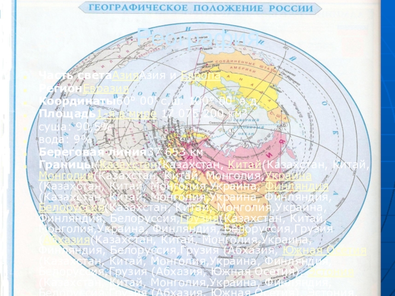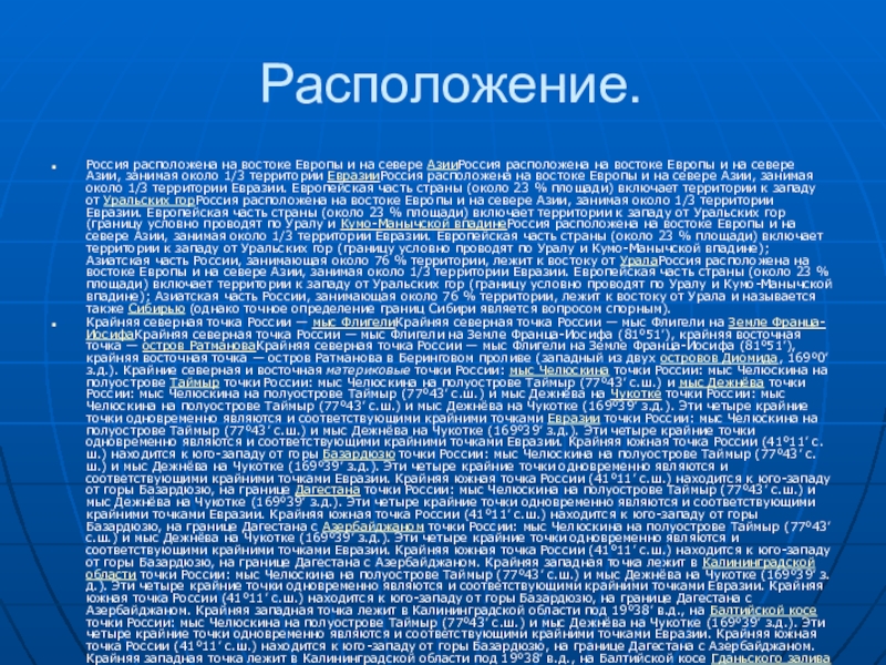 востоке Европы и на севере Азии, занимая около 1/3 территории ЕвразииРоссия расположена на востоке Европы и на севере Азии, занимая около 1/3 территории Евразии. Европейская часть страны (около 23 % площади) включает территории к западу от Уральских горРоссия расположена на востоке Европы и на севере Азии, занимая около 1/3 территории Евразии. Европейская часть страны (около 23 % площади) включает территории к западу от Уральских гор (границу условно проводят по Уралу и Кумо-Манычской впадинеРоссия расположена на востоке Европы и на севере Азии, занимая около 1/3 территории Евразии. Европейская часть страны (около 23 % площади) включает территории к западу от Уральских гор (границу условно проводят по Уралу и Кумо-Манычской впадине); Азиатская часть России, занимающая около 76 % территории, лежит к востоку от УралаРоссия расположена на востоке Европы и на севере Азии, занимая около 1/3 территории Евразии. Европейская часть страны (около 23 % площади) включает территории к западу от Уральских гор (границу условно проводят по Уралу и Кумо-Манычской впадине); Азиатская часть России, занимающая около 76 % территории, лежит к востоку от Урала и называется также Сибирью (однако точное определение границ Сибири является вопросом спорным).