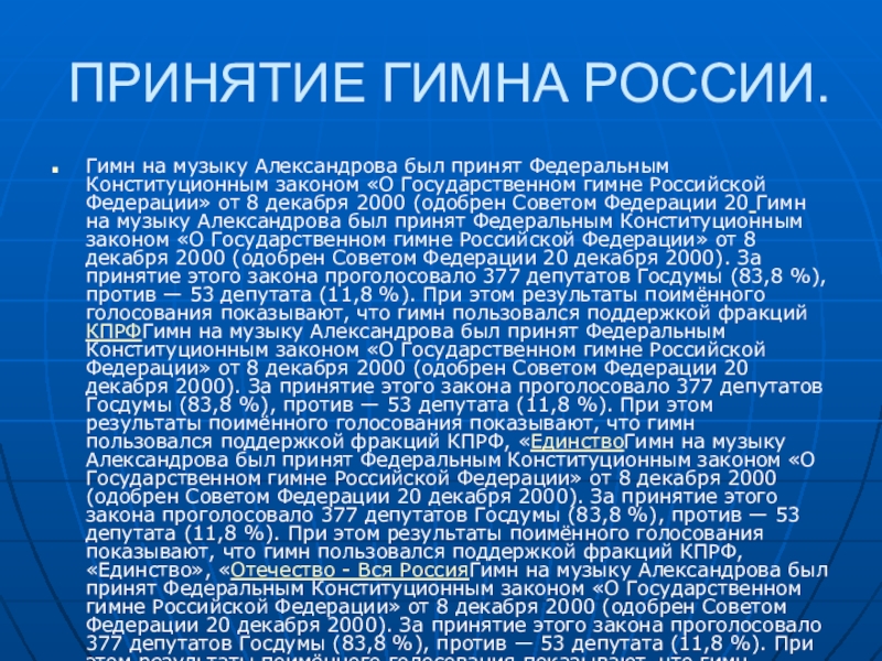 «О Государственном гимне Российской Федерации» от 8 декабря 2000 (одобрен Советом Федерации 20 Гимн на музыку Александрова был принят Федеральным Конституционным законом «О Государственном гимне Российской Федерации» от 8 декабря 2000 (одобрен Советом Федерации 20 декабря 2000). За принятие этого закона проголосовало 377 депутатов Госдумы (83,8 %), против — 53 депутата (11,8 %). При этом результаты поимённого голосования показывают, что гимн пользовался поддержкой фракций КПРФГимн на музыку Александрова был принят Федеральным Конституционным законом «О Государственном гимне Российской Федерации» от 8 декабря 2000 (одобрен Советом Федерации 20 декабря 2000). За принятие этого закона проголосовало 377 депутатов Госдумы (83,8 %), против — 53 депутата (11,8 %). При этом результаты поимённого голосования показывают, что гимн пользовался поддержкой фракций КПРФ, «ЕдинствоГимн на музыку Александрова был принят Федеральным Конституционным законом «О Государственном гимне Российской Федерации» от 8 декабря 2000 (одобрен Советом Федерации 20 декабря 2000). За принятие этого закона проголосовало 377 депутатов Госдумы (83,8 %), против — 53 депутата (11,8 %). При этом результаты поимённого голосования показывают, что гимн пользовался поддержкой фракций КПРФ, «Единство», «Отечество - Вся РоссияГимн на музыку Александрова был принят Федеральным Конституционным законом «О Государственном гимне Российской Федерации» от 8 декабря 2000 (одобрен Советом Федерации 20 декабря 2000). За принятие этого закона проголосовало 377 депутатов Госдумы (83,8 %), против — 53 депутата (11,8 %). При этом результаты поимённого голосования показывают, что гимн пользовался поддержкой фракций КПРФ, «Единство», «Отечество - Вся Россия», ЛДПРГимн на музыку Александрова был принят Федеральным Конституционным законом «О Государственном гимне Российской Федерации» от 8 декабря 2000 (одобрен Советом Федерации 20 декабря 2000). За принятие этого закона проголосовало 377 депутатов Госдумы (83,8 %), против — 53 депутата (11,8 %). При этом результаты поимённого голосования показывают, что гимн пользовался поддержкой фракций КПРФ, «Единство», «Отечество - Вся Россия», ЛДПР, депутатских групп «Народный депутат», «Регионы России», Агропромышленной депутатской группы. Против него выступали несколько оппозиционных фракций — СПСГимн на музыку Александрова был принят Федеральным Конституционным законом «О Государственном гимне Российской Федерации» от 8 декабря 2000 (одобрен Советом Федерации 20 декабря 2000). За принятие этого закона проголосовало 377 депутатов Госдумы (83,8 %), против — 53 депутата (11,8 %). При этом результаты поимённого голосования показывают, что гимн пользовался поддержкой фракций КПРФ, «Единство», «Отечество - Вся Россия», ЛДПР, депутатских групп «Народный депутат», «Регионы России», Агропромышленной депутатской группы. Против него выступали несколько оппозиционных фракций — СПС и «Яблоко».