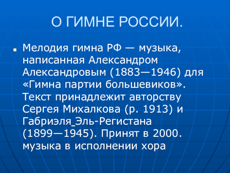 для «Гимна партии большевиков». Текст принадлежит авторству Сергея Михалкова (р. 1913) и Габриэля Эль-Регистана (1899—1945). Принят в 2000. музыка в исполнении хора