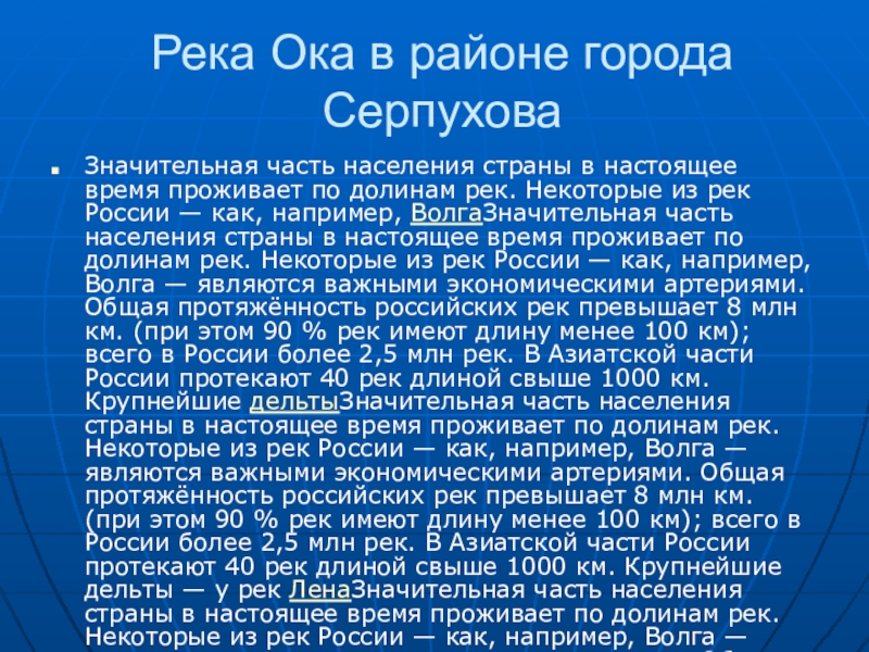 время проживает по долинам рек. Некоторые из рек России — как, например, ВолгаЗначительная часть населения страны в настоящее время проживает по долинам рек. Некоторые из рек России — как, например, Волга — являются важными экономическими артериями. Общая протяжённость российских рек превышает 8 млн км. (при этом 90 % рек имеют длину менее 100 км); всего в России более 2,5 млн рек. В Азиатской части России протекают 40 рек длиной свыше 1000 км. Крупнейшие дельтыЗначительная часть населения страны в настоящее время проживает по долинам рек. Некоторые из рек России — как, например, Волга — являются важными экономическими артериями. Общая протяжённость российских рек превышает 8 млн км. (при этом 90 % рек имеют длину менее 100 км); всего в России более 2,5 млн рек. В Азиатской части России протекают 40 рек длиной свыше 1000 км. Крупнейшие дельты — у рек ЛенаЗначительная часть населения страны в настоящее время проживает по долинам рек. Некоторые из рек России — как, например, Волга — являются важными экономическими артериями. Общая протяжённость российских рек превышает 8 млн км. (при этом 90 % рек имеют длину менее 100 км); всего в России более 2,5 млн рек. В Азиатской части России протекают 40 рек длиной свыше 1000 км. Крупнейшие дельты — у рек Лена и ВолгаЗначительная часть населения страны в настоящее время проживает по долинам рек. Некоторые из рек России — как, например, Волга — являются важными экономическими артериями. Общая протяжённость российских рек превышает 8 млн км. (при этом 90 % рек имеют длину менее 100 км); всего в России более 2,5 млн рек. В Азиатской части России протекают 40 рек длиной свыше 1000 км. Крупнейшие дельты — у рек Лена и Волга, эстуарииЗначительная часть населения страны в настоящее время проживает по долинам рек. Некоторые из рек России — как, например, Волга — являются важными экономическими артериями. Общая протяжённость российских рек превышает 8 млн км. (при этом 90 % рек имеют длину менее 100 км); всего в России более 2,5 млн рек. В Азиатской части России протекают 40 рек длиной свыше 1000 км. Крупнейшие дельты — у рек Лена и Волга, эстуарии — у ОбиЗначительная часть населения страны в настоящее время проживает по долинам рек. Некоторые из рек России — как, например, Волга — являются важными экономическими артериями. Общая протяжённость российских рек превышает 8 млн км. (при этом 90 % рек имеют длину менее 100 км); всего в России более 2,5 млн рек. В Азиатской части России протекают 40 рек длиной свыше 1000 км. Крупнейшие дельты — у рек Лена и Волга, эстуарии — у Оби и ЕнисеяЗначительная часть населения страны в настоящее время проживает по долинам рек. Некоторые из рек России — как, например, Волга — являются важными экономическими артериями. Общая протяжённость российских рек превышает 8 млн км. (при этом 90 % рек имеют длину менее 100 км); всего в России более 2,5 млн рек. В Азиатской части России протекают 40 рек длиной свыше 1000 км. Крупнейшие дельты — у рек Лена и Волга, эстуарии — у Оби и Енисея. Россия занимает второе место (после БразилииЗначительная часть населения страны в настоящее время проживает по долинам рек. Некоторые из рек России — как, например, Волга — являются важными экономическими артериями. Общая протяжённость российских рек превышает 8 млн км. (при этом 90 % рек имеют длину менее 100 км); всего в России более 2,5 млн рек. В Азиатской части Р