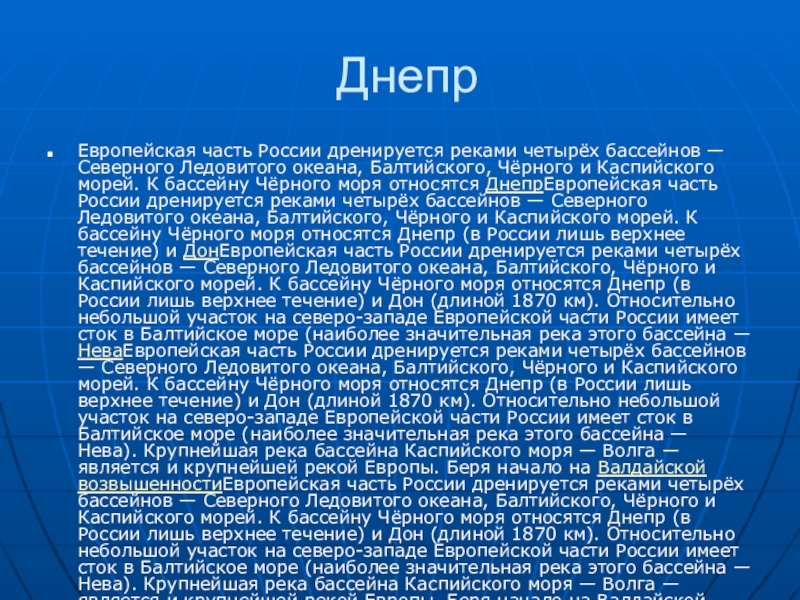 Балтийского, Чёрного и Каспийского морей. К бассейну Чёрного моря относятся ДнепрЕвропейская часть России дренируется реками четырёх бассейнов — Северного Ледовитого океана, Балтийского, Чёрного и Каспийского морей. К бассейну Чёрного моря относятся Днепр (в России лишь верхнее течение) и ДонЕвропейская часть России дренируется реками четырёх бассейнов — Северного Ледовитого океана, Балтийского, Чёрного и Каспийского морей. К бассейну Чёрного моря относятся Днепр (в России лишь верхнее течение) и Дон (длиной 1870 км). Относительно небольшой участок на северо-западе Европейской части России имеет сток в Балтийское море (наиболее значительная река этого бассейна — НеваЕвропейская часть России дренируется реками четырёх бассейнов — Северного Ледовитого океана, Балтийского, Чёрного и Каспийского морей. К бассейну Чёрного моря относятся Днепр (в России лишь верхнее течение) и Дон (длиной 1870 км). Относительно небольшой участок на северо-западе Европейской части России имеет сток в Балтийское море (наиболее значительная река этого бассейна — Нева). Крупнейшая река бассейна Каспийского моря — Волга — является и крупнейшей рекой Европы. Беря начало на Валдайской возвышенностиЕвропейская часть России дренируется реками четырёх бассейнов — Северного Ледовитого океана, Балтийского, Чёрного и Каспийского морей. К бассейну Чёрного моря относятся Днепр (в России лишь верхнее течение) и Дон (длиной 1870 км). Относительно небольшой участок на северо-западе Европейской части России имеет сток в Балтийское море (наиболее значительная река этого бассейна — Нева). Крупнейшая река бассейна Каспийского моря — Волга — является и крупнейшей рекой Европы. Беря начало на Валдайской возвышенности в Тверской областиЕвропейская часть России дренируется реками четырёх бассейнов — Северного Ледовитого океана, Балтийского, Чёрного и Каспийского морей. К бассейну Чёрного моря относятся Днепр (в России лишь верхнее течение) и Дон (длиной 1870 км). Относительно небольшой участок на северо-западе Европейской части России имеет сток в Балтийское море (наиболее значительная река этого бассейна — Нева). Крупнейшая река бассейна Каспийского моря — Волга — является и крупнейшей рекой Европы. Беря начало на Валдайской возвышенности в Тверской области, Волга преодолевает 3530 км на пути к Каспию. Волга имеет четвёртую по величине в России площадь бассейна (1,38 млн км²), уступая по этому показателю лишь ОбиЕвропейская часть России дренируется реками четырёх бассейнов — Северного Ледовитого океана, Балтийского, Чёрного и Каспийского морей. К бассейну Чёрного моря относятся Днепр (в России лишь верхнее течение) и Дон (длиной 1870 км). Относительно небольшой участок на северо-западе Европейской части России имеет сток в Балтийское море (наиболее значительная река этого бассейна — Нева). Крупнейшая река бассейна Каспийского моря — Волга — является и крупнейшей рекой Европы. Беря начало на Валдайской возвышенности в Тверской области, Волга преодолевает 3530 км на пути к Каспию. Волга имеет четвёртую по величине в России площадь бассейна (1,38 млн км²), уступая по этому показателю лишь Оби, ЕнисеюЕвропейская часть России дренируется реками четырёх бассейнов — Северного Ледовитого океана, Балтийского, Чёрного и Каспийского морей. К бассейну Чёрного моря относятс
