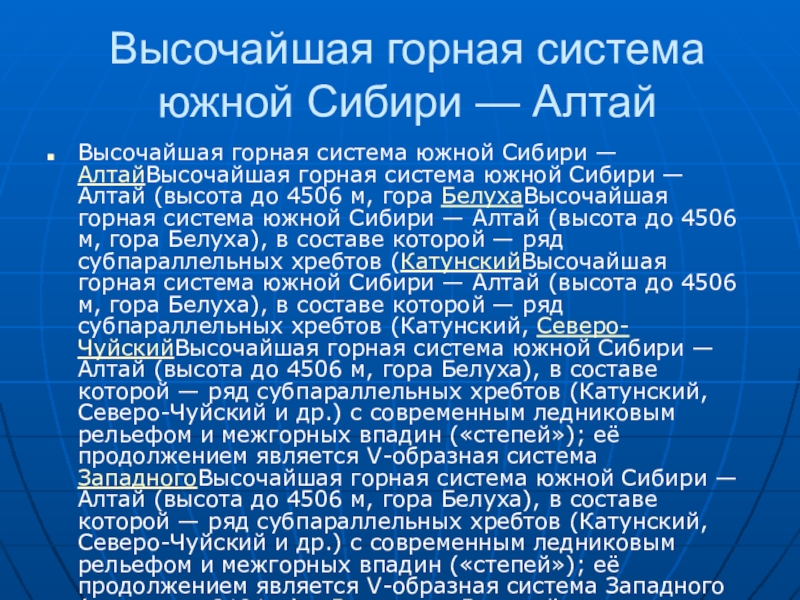 Сибири — АлтайВысочайшая горная система южной Сибири — Алтай (высота до 4506 м, гора БелухаВысочайшая горная система южной Сибири — Алтай (высота до 4506 м, гора Белуха), в составе которой — ряд субпараллельных хребтов (КатунскийВысочайшая горная система южной Сибири — Алтай (высота до 4506 м, гора Белуха), в составе которой — ряд субпараллельных хребтов (Катунский, Северо-ЧуйскийВысочайшая горная система южной Сибири — Алтай (высота до 4506 м, гора Белуха), в составе которой — ряд субпараллельных хребтов (Катунский, Северо-Чуйский и др.) с современным ледниковым рельефом и межгорных впадин («степей»); её продолжением является V-образная система ЗападногоВысочайшая горная система южной Сибири — Алтай (высота до 4506 м, гора Белуха), в составе которой — ряд субпараллельных хребтов (Катунский, Северо-Чуйский и др.) с современным ледниковым рельефом и межгорных впадин («степей»); её продолжением является V-образная система Западного (высота до 3121 м) и ВосточногоВысочайшая горная система южной Сибири — Алтай (высота до 4506 м, гора Белуха), в составе которой — ряд субпараллельных хребтов (Катунский, Северо-Чуйский и др.) с современным ледниковым рельефом и межгорных впадин («степей»); её продолжением является V-образная система Западного (высота до 3121 м) и Восточного (высота до 3491 м) Саяна, окружающая высокую Тувинскую котловинуВысочайшая горная система южной Сибири — Алтай (высота до 4506 м, гора Белуха), в составе которой — ряд субпараллельных хребтов (Катунский, Северо-Чуйский и др.) с современным ледниковым рельефом и межгорных впадин («степей»); её продолжением является V-образная система Западного (высота до 3121 м) и Восточного (высота до 3491 м) Саяна, окружающая высокую Тувинскую котловину; в Восточном Саяне ледниковый рельеф не распространён, поверхности гольцовВысочайшая горная система южной Сибири — Алтай (высота до 4506 м, гора Белуха), в составе которой — ряд субпараллельных хребтов (Катунский, Северо-Чуйский и др.) с современным ледниковым рельефом и межгорных впадин («степей»); её продолжением является V-образная система Западного (высота до 3121 м) и Восточного (высота до 3491 м) Саяна, окружающая высокую Тувинскую котловину; в Восточном Саяне ледниковый рельеф не распространён, поверхности гольцов куполовидные, с нагорными террасами; в Западном Саяне — сильно расчленённый эрозионно-денудационнный рельеф; имеется 61 каровый ледник. Второстепенные хребты Алтая и Саян (кряж СалаирВысочайшая горная система южной Сибири — Алтай (высота до 4506 м, гора Белуха), в составе которой — ряд субпараллельных хребтов (Катунский, Северо-Чуйский и др.) с современным ледниковым рельефом и межгорных впадин («степей»); её продолжением является V-образная система Западного (высота до 3121 м) и Восточного (высота до 3491 м) Саяна, окружающая высокую Тувинскую котловину; в Восточном Саяне ледниковый рельеф не распространён, поверхности гольцов куполовидные, с нагорными террасами; в Западном Саяне — сильно расчленённый эрозионно-денудационнный рельеф; имеется 61 каровый ледник. Второстепенные хребты Алтая и Саян (кряж Салаир, 590 м; Кузнецкий Алатау, 2178 м; Горная ШорияВысочайшая горная система южной Сибири — Алтай (высота до 4506 м, гора Белуха), в составе которой — ряд субпараллельных хребтов (Катунский, Северо-Чуйский и др.) с современным ледниковым рельефом и межгорных впад