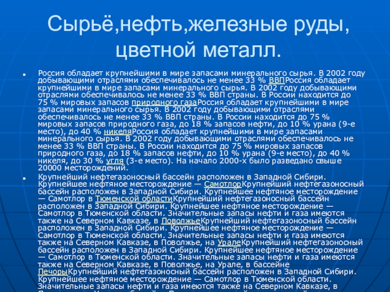 Россия обладает крупнейшими в мире запасами минерального сырья. В