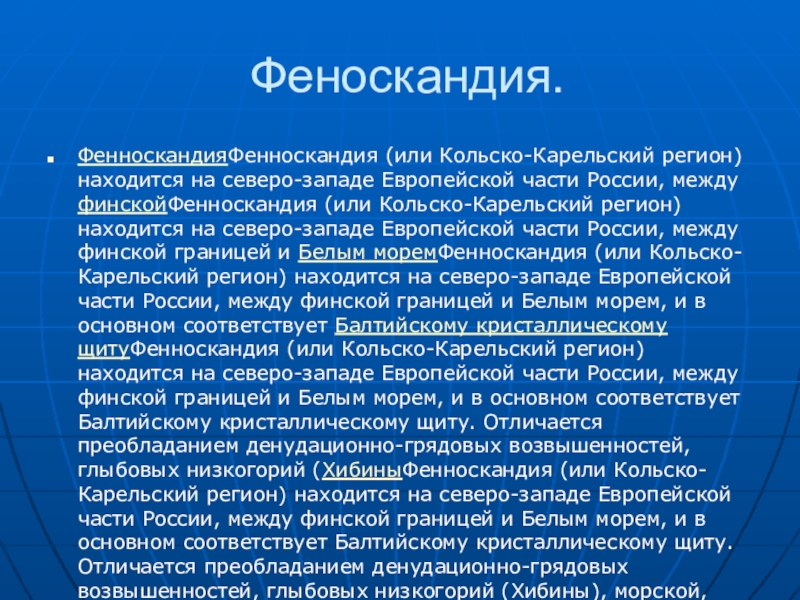 финскойФенноскандия (или Кольско-Карельский регион) находится на северо-западе Европейской части России, между финской границей и Белым моремФенноскандия (или Кольско-Карельский регион) находится на северо-западе Европейской части России, между финской границей и Белым морем, и в основном соответствует Балтийскому кристаллическому щитуФенноскандия (или Кольско-Карельский регион) находится на северо-западе Европейской части России, между финской границей и Белым морем, и в основном соответствует Балтийскому кристаллическому щиту. Отличается преобладанием денудационно-грядовых возвышенностей, глыбовых низкогорий (ХибиныФенноскандия (или Кольско-Карельский регион) находится на северо-западе Европейской части России, между финской границей и Белым морем, и в основном соответствует Балтийскому кристаллическому щиту. Отличается преобладанием денудационно-грядовых возвышенностей, глыбовых низкогорий (Хибины), морской, озёрно-ледниковой и сельговой равнины (поскольку в антропогеновое время территория Фенноскандии являлась центром оледенения, ледниковых форм рельефа здесь много). Наибольшая высота — 1190 м, но преобладают высоты меньше 200 м. Невысокие горы чередуются с заболоченными низинами. Много озёр (в основном в Карелии). В центральной части Кольского полуострова — остатки древних кор выветривания. Полезные ископаемые в Хибинах залегают, как правило, недалеко от поверхности.