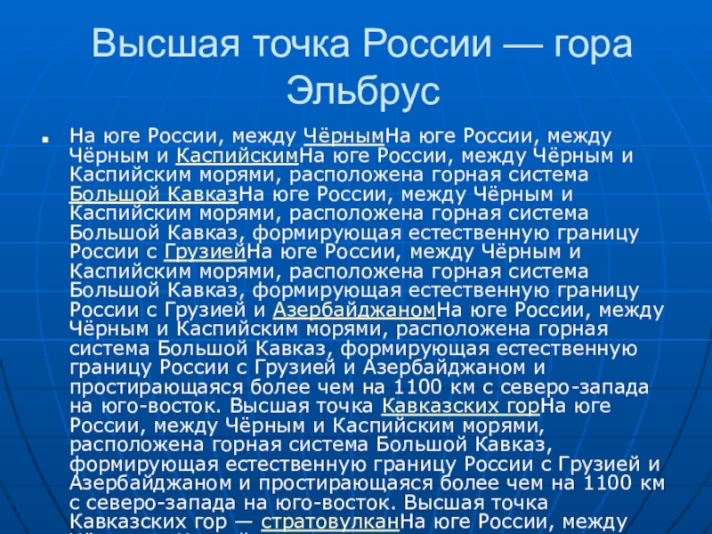 России, между Чёрным и КаспийскимНа юге России, между Чёрным и Каспийским морями, расположена горная система Большой КавказНа юге России, между Чёрным и Каспийским морями, расположена горная система Большой Кавказ, формирующая естественную границу России с ГрузиейНа юге России, между Чёрным и Каспийским морями, расположена горная система Большой Кавказ, формирующая естественную границу России с Грузией и АзербайджаномНа юге России, между Чёрным и Каспийским морями, расположена горная система Большой Кавказ, формирующая естественную границу России с Грузией и Азербайджаном и простирающаяся более чем на 1100 км с северо-запада на юго-восток. Высшая точка Кавказских горНа юге России, между Чёрным и Каспийским морями, расположена горная система Большой Кавказ, формирующая естественную границу России с Грузией и Азербайджаном и простирающаяся более чем на 1100 км с северо-запада на юго-восток. Высшая точка Кавказских гор — стратовулканНа юге России, между Чёрным и Каспийским морями, расположена горная система Большой Кавказ, формирующая естественную границу России с Грузией и Азербайджаном и простирающаяся более чем на 1100 км с северо-запада на юго-восток. Высшая точка Кавказских гор — стратовулкан ЭльбрусНа юге России, между Чёрным и Каспийским морями, расположена горная система Большой Кавказ, формирующая естественную границу России с Грузией и Азербайджаном и простирающаяся более чем на 1100 км с северо-запада на юго-восток. Высшая точка Кавказских гор — стратовулкан Эльбрус (5642 м) — является не только высочайшей горной вершиной России, но и высшей точкой всей Европы. Геологически Кавказские горы входят в состав системы Карпатские горыНа юге России, между Чёрным и Каспийским морями, расположена горная система Большой Кавказ, формирующая естественную границу России с Грузией и Азербайджаном и простирающаяся более чем на 1100 км с северо-запада на юго-восток. Высшая точка Кавказских гор — стратовулкан Эльбрус (5642 м) — является не только высочайшей горной вершиной России, но и высшей точкой всей Европы. Геологически Кавказские горы входят в состав системы Карпатские горы — Крымские горыНа юге России, между Чёрным и Каспийским морями, расположена горная система Большой Кавказ, формирующая естественную границу России с Грузией и Азербайджаном и простирающаяся более чем на 1100 км с северо-запада на юго-восток. Высшая точка Кавказских гор — стратовулкан Эльбрус (5642 м) — является не только высочайшей горной вершиной России, но и высшей точкой всей Европы. Геологически Кавказские горы входят в состав системы Карпатские горы — Крымские горы — Тянь-ШаньНа юге России, между Чёрным и Каспийским морями, расположена горная система Большой Кавказ, формирующая естественную границу России с Грузией и Азербайджаном и простирающаяся более чем на 1100 км с северо-запада на юго-восток. Высшая точка Кавказских гор — стратовулкан Эльбрус (5642 м) — является не только высочайшей горной вершиной России, но и высшей точкой всей Европы. Геологически Кавказские горы входят в состав системы Карпатские горы — Крымские горы — Тянь-Шань — ПамирНа юге России, между Чёрным и Каспийским морями, расположена горная система Большой Кавказ, формирующая естественную границу России с Грузией и Азербайджаном и простирающаяся более чем на 1100 км с северо-запа