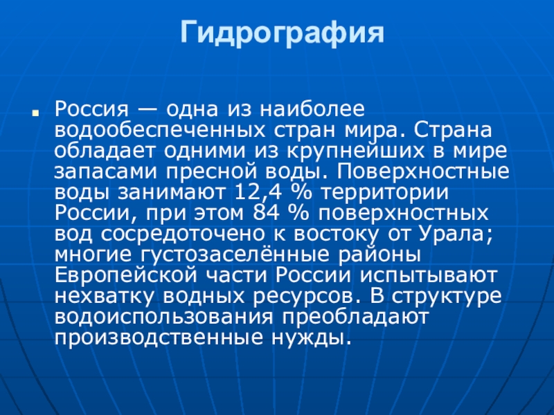 из крупнейших в мире запасами пресной воды. Поверхностные воды занимают 12,4 % территории России, при этом 84 % поверхностных вод сосредоточено к востоку от Урала; многие густозаселённые районы Европейской части России испытывают нехватку водных ресурсов. В структуре водоиспользования преобладают производственные нужды.