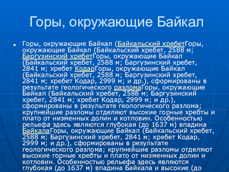 хребет, 2588 м; Баргузинский хребетГоры, окружающие Байкал (Байкальский хребет, 2588 м; Баргузинский хребет, 2841 м; хребет КодарГоры, окружающие Байкал (Байкальский хребет, 2588 м; Баргузинский хребет, 2841 м; хребет Кодар, 2999 м; и др.), сформированы в результате геологического разломаГоры, окружающие Байкал (Байкальский хребет, 2588 м; Баргузинский хребет, 2841 м; хребет Кодар, 2999 м; и др.), сформированы в результате геологического разлома; крупнейшие разломы отделяют высокие горные хребты и плато от низменных долин и котловин. Особенностью рельефа здесь являются глубокая (до 1637 м) впадина БайкалаГоры, окружающие Байкал (Байкальский хребет, 2588 м; Баргузинский хребет, 2841 м; хребет Кодар, 2999 м; и др.), сформированы в результате геологического разлома; крупнейшие разломы отделяют высокие горные хребты и плато от низменных долин и котловин. Особенностью рельефа здесь являются глубокая (до 1637 м) впадина Байкала и высокие (до 2841 м) горы, круто обрывающиеся к западному берегу озера; таким образом, перепад высот в районе Байкала превышает 4500 м. Горы ЗабайкальяГоры, окружающие Байкал (Байкальский хребет, 2588 м; Баргузинский хребет, 2841 м; хребет Кодар, 2999 м; и др.), сформированы в результате геологического разлома; крупнейшие разломы отделяют высокие горные хребты и плато от низменных долин и котловин. Особенностью рельефа здесь являются глубокая (до 1637 м) впадина Байкала и высокие (до 2841 м) горы, круто обрывающиеся к западному берегу озера; таким образом, перепад высот в районе Байкала превышает 4500 м. Горы Забайкалья преимущественно невысокие, с развитым гольцовым и денудационным рельефом; наибольшую высоту имеет Даурский сводГоры, окружающие Байкал (Байкальский хребет, 2588 м; Баргузинский хребет, 2841 м; хребет Кодар, 2999 м; и др.), сформированы в результате геологического разлома; крупнейшие разломы отделяют высокие горные хребты и плато от низменных долин и котловин. Особенностью рельефа здесь являются глубокая (до 1637 м) впадина Байкала и высокие (до 2841 м) горы, круто обрывающиеся к западному берегу озера; таким образом, перепад высот в районе Байкала превышает 4500 м. Горы Забайкалья преимущественно невысокие, с развитым гольцовым и денудационным рельефом; наибольшую высоту имеет Даурский свод (Барун-Шебетский голецГоры, окружающие Байкал (Байкальский хребет, 2588 м; Баргузинский хребет, 2841 м; хребет Кодар, 2999 м; и др.), сформированы в результате геологического разлома; крупнейшие разломы отделяют высокие горные хребты и плато от низменных долин и котловин. Особенностью рельефа здесь являются глубокая (до 1637 м) впадина Байкала и высокие (до 2841 м) горы, круто обрывающиеся к западному берегу озера; таким образом, перепад высот в районе Байкала превышает 4500 м. Горы Забайкалья преимущественно невысокие, с развитым гольцовым и денудационным рельефом; наибольшую высоту имеет Даурский свод (Барун-Шебетский голец — 2524 м). На юго-западе Витимского плоскогорьяГоры, окружающие Байкал (Байкальский хребет, 2588 м; Баргузинский хребет, 2841 м; хребет Кодар, 2999 м; и др.), сформированы в результате геологического разлома; крупнейшие разломы отделяют высокие горные хребты и плато от низменных долин и котловин. Особенностью рельефа здесь являются глубокая (до 1637 м) впадина Байкала и высокие (до 2841 м) горы, круто обрывающиеся к западному берегу озера; таким образом, перепад высот в районе Байкала