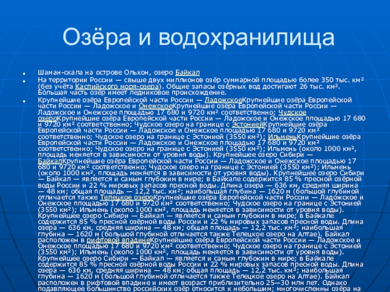 Крупнейшие озёра Европейской части России — ЛадожскоеКрупнейшие озёра Европейской части России — Ладожское и ОнежскоеКрупнейшие озёра Европейской части России — Ладожское и Онежское площадью 17 680 и 9720 км² соответственно; Чудское озероКрупнейшие озёра Европейской части России — Ладожское и Онежское площадью 17 680 и 9720 км² соответственно; Чудское озеро на границе с ЭстониейКрупнейшие озёра Европейской части России — Ладожское и Онежское площадью 17 680 и 9720 км² соответственно; Чудское озеро на границе с Эстонией (3550 км²); ИльменьКрупнейшие озёра Европейской части России — Ладожское и Онежское площадью 17 680 и 9720 км² соответственно; Чудское озеро на границе с Эстонией (3550 км²); Ильмень (около 1000 км², площадь меняется в зависимости от уровня воды). Крупнейшее озеро Сибири — БайкалКрупнейшие озёра Европейской части России — Ладожское и Онежское площадью 17 680 и 9720 км² соответственно; Чудское озеро на границе с Эстонией (3550 км²); Ильмень (около 1000 км², площадь меняется в зависимости от уровня воды). Крупнейшее озеро Сибири — Байкал — является и самым глубоким в мире; в Байкале содержится 85 % пресной озёрной воды России и 22 % мировых запасов пресной воды. Длина озера — 636 км, средняя ширина — 48 км; общая площадь — 12,2 тыс. км²; наибольшая глубина — 1620 м (большой глубиной отличается также Телецкое озероКрупнейшие озёра Европейской части России — Ладожское и Онежское площадью 17 680 и 9720 км² соответственно; Чудское озеро на границе с Эстонией (3550 км²); Ильмень (около 1000 км², площадь меняется в зависимости от уровня воды). Крупнейшее озеро Сибири — Байкал — является и самым глубоким в мире; в Байкале содержится 85 % пресной озёрной воды России и 22 % мировых запасов пресной воды. Длина озера — 636 км, средняя ширина — 48 км; общая площадь — 12,2 тыс. км²; наибольшая глубина — 1620 м (большой глубиной отличается также Телецкое озеро на Алтае). Байкал расположен в рифтовой впадинеКрупнейшие озёра Европейской части России — Ладожское и Онежское площадью 17 680 и 9720 км² соответственно; Чудское озеро на границе с Эстонией (3550 км²); Ильмень (около 1000 км², площадь меняется в зависимости от уровня воды). Крупнейшее озеро Сибири — Байкал — является и самым глубоким в мире; в Байкале содержится 85 % пресной озёрной воды России и 22 % мировых запасов пресной воды. Длина озера — 636 км, средняя ширина — 48 км; общая площадь — 12,2 тыс. км²; наибольшая глубина — 1620 м (большой глубиной отличается также Телецкое озеро на Алтае). Байкал расположен в рифтовой впадине и имеет возраст приблизительно 25—30 млн лет. Однако подавляющее большинство российских озёр относится к небольшим; многочисленны озёра на северо-западе Европейской части России (особенно в КарелииКрупнейшие озёра Европейской части России — Ладожское и Онежское площадью 17 680 и 9720 км² соответственно; Чудское озеро на границе с Эстонией (3550 км²); Ильмень (около 1000 км², площадь меняется в зависимости от уровня воды). Крупнейшее озеро Сибири — Байкал — является и самым глубоким в мире; в Байкале содержится 85 % пресной озёрной воды России и 22 % мировых запасов пресной воды. Длина озера — 636 км, средняя ширина — 48 км; общая площадь — 12,2 тыс. км²; наибольшая глубина — 1620 м (большой глубиной отличается также Телецкое озеро на Алтае). Байкал расположен в рифтовой впадине и имеет возраст приблизительно 25—30 млн лет. Однако подавляющее бо