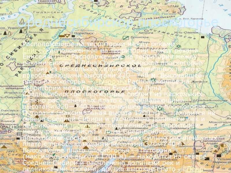 Енисей и ЛенаРасположенное на территории между реками Енисей и Лена Среднесибирское плоскогорье состоит из нескольких сильно расчленённых плато с преобладающими высотами 320—740 м. Высочайшее плато плоскогорья — ПуторанаРасположенное на территории между реками Енисей и Лена Среднесибирское плоскогорье состоит из нескольких сильно расчленённых плато с преобладающими высотами 320—740 м. Высочайшее плато плоскогорья — Путорана (максимальная высота 1700 м) — находится на севере Средней Сибири и расчленено долинами рек и ледниковыми трогамиРасположенное на территории между реками Енисей и Лена Среднесибирское плоскогорье состоит из нескольких сильно расчленённых плато с преобладающими высотами 320—740 м. Высочайшее плато плоскогорья — Путорана (максимальная высота 1700 м) — находится на севере Средней Сибири и расчленено долинами рек и ледниковыми трогами; другие высокие плато — Лено-АнгарскоеРасположенное на территории между реками Енисей и Лена Среднесибирское плоскогорье состоит из нескольких сильно расчленённых плато с преобладающими высотами 320—740 м. Высочайшее плато плоскогорья — Путорана (максимальная высота 1700 м) — находится на севере Средней Сибири и расчленено долинами рек и ледниковыми трогами; другие высокие плато — Лено-Ангарское и СавермаРасположенное на территории между реками Енисей и Лена Среднесибирское плоскогорье состоит из нескольких сильно расчленённых плато с преобладающими высотами 320—740 м. Высочайшее плато плоскогорья — Путорана (максимальная высота 1700 м) — находится на севере Средней Сибири и расчленено долинами рек и ледниковыми трогами; другие высокие плато — Лено-Ангарское и Саверма; наиболее высокие кряжиРасположенное на территории между реками Енисей и Лена Среднесибирское плоскогорье состоит из нескольких сильно расчленённых плато с преобладающими высотами 320—740 м. Высочайшее плато плоскогорья — Путорана (максимальная высота 1700 м) — находится на севере Средней Сибири и расчленено долинами рек и ледниковыми трогами; другие высокие плато — Лено-Ангарское и Саверма; наиболее высокие кряжи — ЕнисейскийРасположенное на территории между реками Енисей и Лена Среднесибирское плоскогорье состоит из нескольких сильно расчленённых плато с преобладающими высотами 320—740 м. Высочайшее плато плоскогорья — Путорана (максимальная высота 1700 м) — находится на севере Средней Сибири и расчленено долинами рек и ледниковыми трогами; другие высокие плато — Лено-Ангарское и Саверма; наиболее высокие кряжи — Енисейский (1104 м) и АнгарскийРасположенное на территории между реками Енисей и Лена Среднесибирское плоскогорье состоит из нескольких сильно расчленённых плато с преобладающими высотами 320—740 м. Высочайшее плато плоскогорья — Путорана (максимальная высота 1700 м) — находится на севере Средней Сибири и расчленено долинами рек и ледниковыми трогами; другие высокие плато — Лено-Ангарское и Саверма; наиболее высокие кряжи — Енисейский (1104 м) и Ангарский. На юге плоскогорье граничит с хребтами Восточного СаянаРасположенное на территории между реками Енисей и Лена Среднесибирское плоскогорье состоит из нескольких сильно расчленённых плато с преобладающими высотами 320—740 м. Высочайшее плато плоскогорья — Путорана (максимальная высота 1700 м) — находится на севере Средней Сибири и расчлен