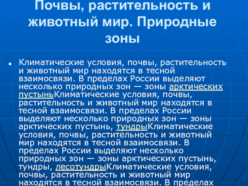 животный мир находятся в тесной взаимосвязи. В пределах России выделяют несколько природных зон — зоны арктических пустыньКлиматические условия, почвы, растительность и животный мир находятся в тесной взаимосвязи. В пределах России выделяют несколько природных зон — зоны арктических пустынь, тундрыКлиматические условия, почвы, растительность и животный мир находятся в тесной взаимосвязи. В пределах России выделяют несколько природных зон — зоны арктических пустынь, тундры, лесотундрыКлиматические условия, почвы, растительность и животный мир находятся в тесной взаимосвязи. В пределах России выделяют несколько природных зон — зоны арктических пустынь, тундры, лесотундры, тайгиКлиматические условия, почвы, растительность и животный мир находятся в тесной взаимосвязи. В пределах России выделяют несколько природных зон — зоны арктических пустынь, тундры, лесотундры, тайги, смешанныхКлиматические условия, почвы, растительность и животный мир находятся в тесной взаимосвязи. В пределах России выделяют несколько природных зон — зоны арктических пустынь, тундры, лесотундры, тайги, смешанных и широколиственныхКлиматические условия, почвы, растительность и животный мир находятся в тесной взаимосвязи. В пределах России выделяют несколько природных зон — зоны арктических пустынь, тундры, лесотундры, тайги, смешанных и широколиственных лесов, лесостепиКлиматические условия, почвы, растительность и животный мир находятся в тесной взаимосвязи. В пределах России выделяют несколько природных зон — зоны арктических пустынь, тундры, лесотундры, тайги, смешанных и широколиственных лесов, лесостепи, степиКлиматические условия, почвы, растительность и животный мир находятся в тесной взаимосвязи. В пределах России выделяют несколько природных зон — зоны арктических пустынь, тундры, лесотундры, тайги, смешанных и широколиственных лесов, лесостепи, степи, полупустыньКлиматические условия, почвы, растительность и животный мир находятся в тесной взаимосвязи. В пределах России выделяют несколько природных зон — зоны арктических пустынь, тундры, лесотундры, тайги, смешанных и широколиственных лесов, лесостепи, степи, полупустынь и пустыньКлиматические условия, почвы, растительность и животный мир находятся в тесной взаимосвязи. В пределах России выделяют несколько природных зон — зоны арктических пустынь, тундры, лесотундры, тайги, смешанных и широколиственных лесов, лесостепи, степи, полупустынь и пустынь. Наиболее чётко природная зональность выражена к западу от ЕнисеяКлиматические условия, почвы, растительность и животный мир находятся в тесной взаимосвязи. В пределах России выделяют несколько природных зон — зоны арктических пустынь, тундры, лесотундры, тайги, смешанных и широколиственных лесов, лесостепи, степи, полупустынь и пустынь. Наиболее чётко природная зональность выражена к западу от Енисея, к востоку от Енисея зональность прослеживается слабее из-за сложного характера рельефа и резко континентального климата. Поскольку значительная часть территории страны занята горами, для многих районов характерна высотная поясность