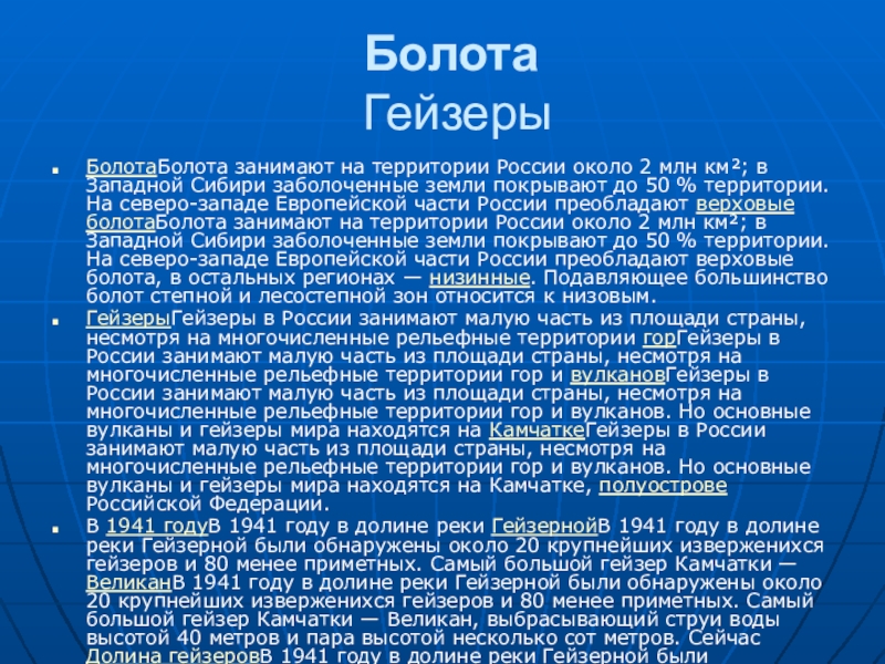 ГейзерыГейзеры в России занимают малую часть из площади страны, несмотря на многочисленные рельефные территории горГейзеры в России занимают малую часть из площади страны, несмотря на многочисленные рельефные территории гор и вулкановГейзеры в России занимают малую часть из площади страны, несмотря на многочисленные рельефные территории гор и вулканов. Но основные вулканы и гейзеры мира находятся на КамчаткеГейзеры в России занимают малую часть из площади страны, несмотря на многочисленные рельефные территории гор и вулканов. Но основные вулканы и гейзеры мира находятся на Камчатке, полуострове Российской Федерации.