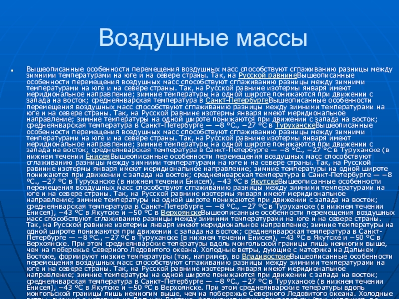 температурами на юге и на севере страны. Так, на Русской равнинеВышеописанные особенности перемещения воздушных масс способствуют сглаживанию разницы между зимними температурами на юге и на севере страны. Так, на Русской равнине изотермы января имеют меридиональное направление; зимние температуры на одной широте понижаются при движении с запада на восток; среднеянварская температура в Санкт-ПетербургеВышеописанные особенности перемещения воздушных масс способствуют сглаживанию разницы между зимними температурами на юге и на севере страны. Так, на Русской равнине изотермы января имеют меридиональное направление; зимние температуры на одной широте понижаются при движении с запада на восток; среднеянварская температура в Санкт-Петербурге — −8 °C., −27 °C в ТуруханскеВышеописанные особенности перемещения воздушных масс способствуют сглаживанию разницы между зимними температурами на юге и на севере страны. Так, на Русской равнине изотермы января имеют меридиональное направление; зимние температуры на одной широте понижаются при движении с запада на восток; среднеянварская температура в Санкт-Петербурге — −8 °C., −27 °C в Туруханске (в нижнем течении ЕнисеяВышеописанные особенности перемещения воздушных масс способствуют сглаживанию разницы между зимними температурами на юге и на севере страны. Так, на Русской равнине изотермы января имеют меридиональное направление; зимние температуры на одной широте понижаются при движении с запада на восток; среднеянварская температура в Санкт-Петербурге — −8 °C., −27 °C в Туруханске (в нижнем течении Енисея), −43 °C в ЯкутскеВышеописанные особенности перемещения воздушных масс способствуют сглаживанию разницы между зимними температурами на юге и на севере страны. Так, на Русской равнине изотермы января имеют меридиональное направление; зимние температуры на одной широте понижаются при движении с запада на восток; среднеянварская температура в Санкт-Петербурге — −8 °C., −27 °C в Туруханске (в нижнем течении Енисея), −43 °C в Якутске и −50 °C в ВерхоянскеВышеописанные особенности перемещения воздушных масс способствуют сглаживанию разницы между зимними температурами на юге и на севере страны. Так, на Русской равнине изотермы января имеют меридиональное направление; зимние температуры на одной широте понижаются при движении с запада на восток; среднеянварская температура в Санкт-Петербурге — −8 °C., −27 °C в Туруханске (в нижнем течении Енисея), −43 °C в Якутске и −50 °C в Верхоянске. При этом среднеянварские тепературы вдоль монгольской границы лишь немногим выше, чем на побережье Северного Ледовитого океана. Холодные ветры, дующие с материка на Дальнем Востоке, формируют низкие температуры (так, например, во ВладивостокеВышеописанные особенности перемещения воздушных масс способствуют сглаживанию разницы между зимними температурами на юге и на севере страны. Так, на Русской равнине изотермы января имеют меридиональное направление; зимние температуры на одной широте понижаются при движении с запада на восток; среднеянварская температура в Санкт-Петербурге — −8 °C., −27 °C в Туруханске (в нижнем течении Енисея), −43 °C в Якутске и −50 °C в Верхоянске. При этом среднеянварские тепературы вдоль монгольской границы лишь немногим выше, чем на побережье Северного Ледовитого океана. Хол