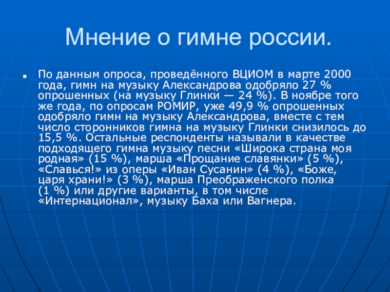года, гимн на музыку Александрова одобряло 27 % опрошенных (на музыку Глинки — 24 %). В ноябре того же года, по опросам РОМИР, уже 49,9 % опрошенных одобряло гимн на музыку Александрова, вместе с тем число сторонников гимна на музыку Глинки снизилось до 15,5 %. Остальные респонденты называли в качестве подходящего гимна музыку песни «Широка страна моя родная» (15 %), марша «Прощание славянки» (5 %), «Славься!» из оперы «Иван Сусанин» (4 %), «Боже, царя храни!» (3 %), марша Преображенского полка (1 %) или другие варианты, в том числе «Интернационал», музыку Баха или Вагнера.