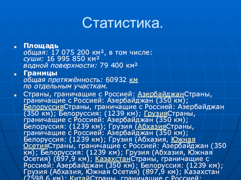 Общая протяжённость границ России — 60 933 км (из них 38 808 км — морские границы); границы России на севере и на востоке — морские, на юге и на западе — в основном сухопутные. Страна имеет сухопутные границы с КазахстаномОбщая протяжённость границ России — 60 933 км (из них 38 808 км — морские границы); границы России на севере и на востоке — морские, на юге и на западе — в основном сухопутные. Страна имеет сухопутные границы с Казахстаном (7598.6 км), КитаемОбщая протяжённость границ России — 60 933 км (из них 38 808 км — морские границы); границы России на севере и на востоке — морские, на юге и на западе — в основном сухопутные. Страна имеет сухопутные границы с Казахстаном (7598.6 км), Китаем (4209.3 км), МонголиейОбщая протяжённость границ России — 60 933 км (из них 38 808 км — морские границы); границы России на севере и на востоке — морские, на юге и на западе — в основном сухопутные. Страна имеет сухопутные границы с Казахстаном (7598.6 км), Китаем (4209.3 км), Монголией (3485 км), УкраинойОбщая протяжённость границ России — 60 933 км (из них 38 808 км — морские границы); границы России на севере и на востоке — морские, на юге и на западе — в основном сухопутные. Страна имеет сухопутные границы с Казахстаном (7598.6 км), Китаем (4209.3 км), Монголией (3485 км), Украиной (2245.8 км), ФинляндиейОбщая протяжённость границ России — 60 933 км (из них 38 808 км — морские границы); границы России на севере и на востоке — морские, на юге и на западе — в основном сухопутные. Страна имеет сухопутные границы с Казахстаном (7598.6 км), Китаем (4209.3 км), Монголией (3485 км), Украиной (2245.8 км), Финляндией (1325.8 км), БелоруссиейОбщая протяжённость границ России — 60 933 км (из них 38 808 км — морские границы); границы России на севере и на востоке — морские, на юге и на западе — в основном сухопутные. Страна имеет сухопутные границы с Казахстаном (7598.6 км), Китаем (4209.3 км), Монголией (3485 км), Украиной (2245.8 км), Финляндией (1325.8 км), Белоруссией (1239 км), ГрузиейОбщая протяжённость границ России — 60 933 км (из них 38 808 км — морские границы); границы России на севере и на востоке — морские, на юге и на западе — в основном сухопутные. Страна имеет сухопутные границы с Казахстаном (7598.6 км), Китаем (4209.3 км), Монголией (3485 км), Украиной (2245.8 км), Финляндией (1325.8 км), Белоруссией (1239 км), Грузией, АбхазиейОбщая протяжённость границ России — 60 933 км (из них 38 808 км — морские границы); границы России на севере и на востоке — морские, на юге и на западе — в основном сухопутные. Страна имеет сухопутные границы с Казахстаном (7598.6 км), Китаем (4209.3 км), Монголией (3485 км), Украиной (2245.8 км), Финляндией (1325.8 км), Белоруссией (1239 км), Грузией, Абхазией,Южной ОсетиейОбщая протяжённость границ России — 60 933 км (из них 38 808 км — морские границы); границы России на севере и на востоке — морские, на юге и на западе — в основном сухопутные. Страна имеет сухопутные границы с Казахстаном (7598.6 км), Китаем (4209.3 км), Монголией (3485 км), Украиной (2245.8 км), Финляндией (1325.8 км), Белоруссией (1239 км), Грузией, Абхазией,Южной Осетией (879.9 км), Эстонией (466.8 км), АзербайджаномОбщая протяжённость границ России — 60 933 км (из них 38 808 км — морские границы); границы России на севере и на востоке — морские, на юге и на западе — в основном сухопутные. Страна имеет сухопутные границы с Казахстаном (7598.6 км), Китаем (4209.3 км), Монголией (3485 км), Украиной (2245.8 км), Финляндией (1325.8 км), Белоруссией (1239 км), Грузией, Абхазией,Южной Осетие
