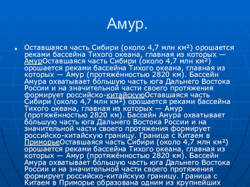 океана, главная из которых — АмурОставшаяся часть Сибири (около 4,7 млн км²) орошается реками бассейна Тихого океана, главная из которых — Амур (протяжённостью 2820 км). Бассейн Амура охватывает бо́льшую часть юга Дальнего Востока России и на значительной части своего протяжения формирует российско-китайскуюОставшаяся часть Сибири (около 4,7 млн км²) орошается реками бассейна Тихого океана, главная из которых — Амур (протяжённостью 2820 км). Бассейн Амура охватывает бо́льшую часть юга Дальнего Востока России и на значительной части своего протяжения формирует российско-китайскую границу. Граница с Китаем в ПриморьеОставшаяся часть Сибири (около 4,7 млн км²) орошается реками бассейна Тихого океана, главная из которых — Амур (протяжённостью 2820 км). Бассейн Амура охватывает бо́льшую часть юга Дальнего Востока России и на значительной части своего протяжения формирует российско-китайскую границу. Граница с Китаем в Приморье образована одним из крупнейших притоков Амура — Уссури. К северу от устья Амура водораздел подходит близко к береговой линии, поэтому реки здесь коротки и отличаются бурным течением.