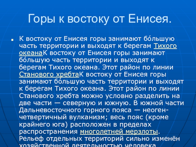 часть территории и выходят к берегам Тихого океанаК востоку от Енисея горы занимают бо́льшую часть территории и выходят к берегам Тихого океана. Этот район по линии Станового хребтаК востоку от Енисея горы занимают бо́льшую часть территории и выходят к берегам Тихого океана. Этот район по линии Станового хребта можно условно разделить на две части — северную и южную. В южной части Дальневосточного горного пояса — неоген-четвертичный вулканизм; весь пояс (кроме крайнего юга) расположен в пределах распространения многолетней мерзлоты. Рельеф отдельных территорий сильно изменён хозяйственной деятельностью человека (добычей полезных ископаемых