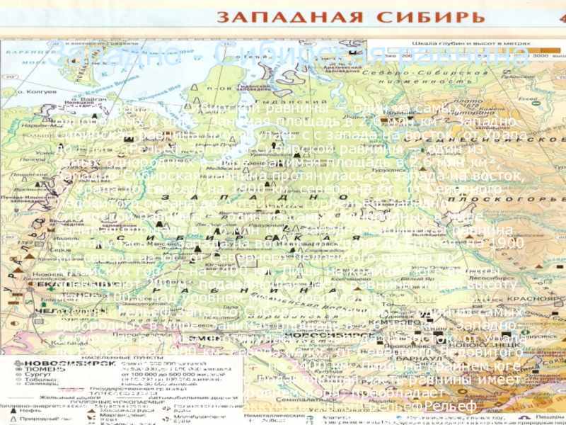 в мире. Занимая площадь в 2,6 млн км², Западно-Сибирская равнина протянулась с с запада на восток, от Урала до ЕнисеяРельеф Западно-Сибирской равнины — один из самых однородных в мире. Занимая площадь в 2,6 млн км², Западно-Сибирская равнина протянулась с с запада на восток, от Урала до Енисея, на 1900 км, севера на юг, от Северного Ледовитого океана до Алтайских горРельеф Западно-Сибирской равнины — один из самых однородных в мире. Занимая площадь в 2,6 млн км², Западно-Сибирская равнина протянулась с с запада на восток, от Урала до Енисея, на 1900 км, севера на юг, от Северного Ледовитого океана до Алтайских гор, — на 2400 км. Лишь на крайнем юге высоты превышают 200 м; подавляющая часть равнины имеет высоту менее 100 м над уровнем моря; преобладает аллювиально-озёрныйРельеф Западно-Сибирской равнины — один из самых однородных в мире. Занимая площадь в 2,6 млн км², Западно-Сибирская равнина протянулась с с запада на восток, от Урала до Енисея, на 1900 км, севера на юг, от Северного Ледовитого океана до Алтайских гор, — на 2400 км. Лишь на крайнем юге высоты превышают 200 м; подавляющая часть равнины имеет высоту менее 100 м над уровнем моря; преобладает аллювиально-озёрный и аккумулятивный рельефРельеф Западно-Сибирской равнины — один из самых однородных в мире. Занимая площадь в 2,6 млн км², Западно-Сибирская равнина протянулась с с запада на восток, от Урала до Енисея, на 1900 км, севера на юг, от Северного Ледовитого океана до Алтайских гор, — на 2400 км. Лишь на крайнем юге высоты превышают 200 м; подавляющая часть равнины имеет высоту менее 100 м над уровнем моря; преобладает аллювиально-озёрный и аккумулятивный рельеф (на юге также денудационныйРельеф Западно-Сибирской равнины — один из самых однородных в мире. Занимая площадь в 2,6 млн км², Западно-Сибирская равнина протянулась с с запада на восток, от Урала до Енисея, на 1900 км, севера на юг, от Северного Ледовитого океана до Алтайских гор, — на 2400 км. Лишь на крайнем юге высоты превышают 200 м; подавляющая часть равнины имеет высоту менее 100 м над уровнем моря; преобладает аллювиально-озёрный и аккумулятивный рельеф (на юге также денудационный). Такие характерные для Западной Сибири черты рельефа, как обширные поймы и огромные болота, особенно распространены в северной части равнины; рельеф к северу от широтного участка реки Обь сформирован под влиянием трансгрессийРельеф Западно-Сибирской равнины — один из самых однородных в мире. Занимая площадь в 2,6 млн км², Западно-Сибирская равнина протянулась с с запада на восток, от Урала до Енисея, на 1900 км, севера на юг, от Северного Ледовитого океана до Алтайских гор, — на 2400 км. Лишь на крайнем юге высоты превышают 200 м; подавляющая часть равнины имеет высоту менее 100 м над уровнем моря; преобладает аллювиально-озёрный и аккумулятивный рельеф (на юге также денудационный). Такие характерные для Западной Сибири черты рельефа, как обширные поймы и огромные болота, особенно распространены в северной части равнины; рельеф к северу от широтного участка реки Обь сформирован под влиянием трансгрессий моря и ледников. На северо-западе и на северо-востоке Западно-Сибирской равнины рельеф аккумулятивный ледниковый, образованный ледниками, спускавшимися с гор Северного Урала и плато Путорана. Долины крупных рек террасированы. На полуостровах Ямал и Гыдан — эоловые дюны. Относител