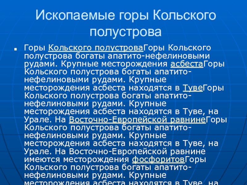 рудами. Крупные месторождения асбестаГоры Кольского полустрова богаты апатито-нефелиновыми рудами. Крупные месторождения асбеста находятся в ТувеГоры Кольского полустрова богаты апатито-нефелиновыми рудами. Крупные месторождения асбеста находятся в Туве, на Урале. На Восточно-Европейской равнинеГоры Кольского полустрова богаты апатито-нефелиновыми рудами. Крупные месторождения асбеста находятся в Туве, на Урале. На Восточно-Европейской равнине имеются месторождения фосфоритовГоры Кольского полустрова богаты апатито-нефелиновыми рудами. Крупные месторождения асбеста находятся в Туве, на Урале. На Восточно-Европейской равнине имеются месторождения фосфоритов, различных строительных материалов. Бо́льшая часть запасов калийных солейГоры Кольского полустрова богаты апатито-нефелиновыми рудами. Крупные месторождения асбеста находятся в Туве, на Урале. На Восточно-Европейской равнине имеются месторождения фосфоритов, различных строительных материалов. Бо́льшая часть запасов калийных солей сосредоточена в Верхнекамском месторожденииГоры Кольского полустрова богаты апатито-нефелиновыми рудами. Крупные месторождения асбеста находятся в Туве, на Урале. На Восточно-Европейской равнине имеются месторождения фосфоритов, различных строительных материалов. Бо́льшая часть запасов калийных солей сосредоточена в Верхнекамском месторождении (Пермский крайГоры Кольского полустрова богаты апатито-нефелиновыми рудами. Крупные месторождения асбеста находятся в Туве, на Урале. На Восточно-Европейской равнине имеются месторождения фосфоритов, различных строительных материалов. Бо́льшая часть запасов калийных солей сосредоточена в Верхнекамском месторождении (Пермский край). Во многих горных районах страны — месторождения драгоценных и полудрагоценных камней (аметистовГоры Кольского полустрова богаты апатито-нефелиновыми рудами. Крупные месторождения асбеста находятся в Туве, на Урале. На Восточно-Европейской равнине имеются месторождения фосфоритов, различных строительных материалов. Бо́льшая часть запасов калийных солей сосредоточена в Верхнекамском месторождении (Пермский край). Во многих горных районах страны — месторождения драгоценных и полудрагоценных камней (аметистов, гранатовГоры Кольского полустрова богаты апатито-нефелиновыми рудами. Крупные месторождения асбеста находятся в Туве, на Урале. На Восточно-Европейской равнине имеются месторождения фосфоритов, различных строительных материалов. Бо́льшая часть запасов калийных солей сосредоточена в Верхнекамском месторождении (Пермский край). Во многих горных районах страны — месторождения драгоценных и полудрагоценных камней (аметистов, гранатов, яшмГоры Кольского полустрова богаты апатито-нефелиновыми рудами. Крупные месторождения асбеста находятся в Туве, на Урале. На Восточно-Европейской равнине имеются месторождения фосфоритов, различных строительных материалов. Бо́льшая часть запасов калийных солей сосредоточена в Верхнекамском месторождении (Пермский край). Во многих горных районах страны — месторождения драгоценных и полудрагоценных камней (аметистов, гранатов, яшм, родонитаГоры Кольского полустрова богаты апатито-нефелиновыми рудами. Крупные месторождения асбеста находятся в Туве, на Урале. На Восточно-Европейской рав