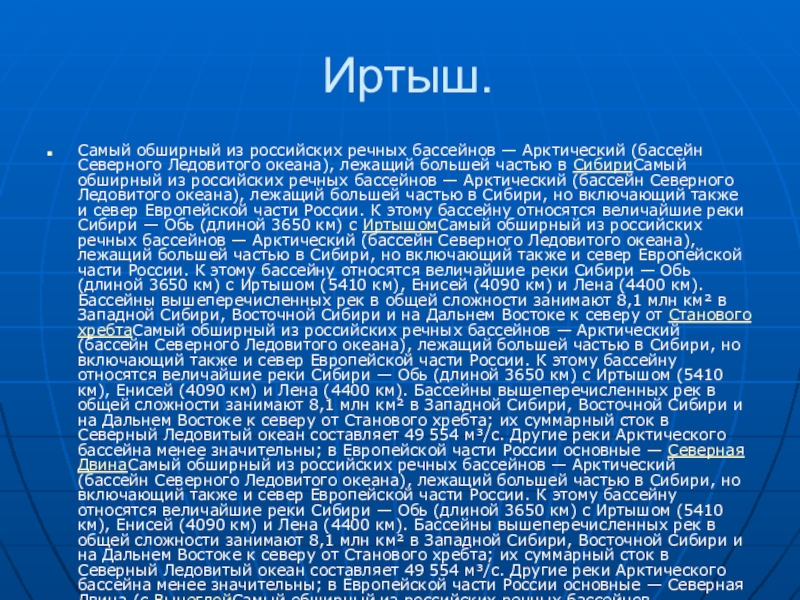 океана), лежащий большей частью в СибириСамый обширный из российских речных бассейнов — Арктический (бассейн Северного Ледовитого океана), лежащий большей частью в Сибири, но включающий также и север Европейской части России. К этому бассейну относятся величайшие реки Сибири — Обь (длиной 3650 км) с ИртышомСамый обширный из российских речных бассейнов — Арктический (бассейн Северного Ледовитого океана), лежащий большей частью в Сибири, но включающий также и север Европейской части России. К этому бассейну относятся величайшие реки Сибири — Обь (длиной 3650 км) с Иртышом (5410 км), Енисей (4090 км) и Лена (4400 км). Бассейны вышеперечисленных рек в общей сложности занимают 8,1 млн км² в Западной Сибири, Восточной Сибири и на Дальнем Востоке к северу от Станового хребтаСамый обширный из российских речных бассейнов — Арктический (бассейн Северного Ледовитого океана), лежащий большей частью в Сибири, но включающий также и север Европейской части России. К этому бассейну относятся величайшие реки Сибири — Обь (длиной 3650 км) с Иртышом (5410 км), Енисей (4090 км) и Лена (4400 км). Бассейны вышеперечисленных рек в общей сложности занимают 8,1 млн км² в Западной Сибири, Восточной Сибири и на Дальнем Востоке к северу от Станового хребта; их суммарный сток в Северный Ледовитый океан составляет 49 554 м³/с. Другие реки Арктического бассейна менее значительны; в Европейской части России основные — Северная ДвинаСамый обширный из российских речных бассейнов — Арктический (бассейн Северного Ледовитого океана), лежащий большей частью в Сибири, но включающий также и север Европейской части России. К этому бассейну относятся величайшие реки Сибири — Обь (длиной 3650 км) с Иртышом (5410 км), Енисей (4090 км) и Лена (4400 км). Бассейны вышеперечисленных рек в общей сложности занимают 8,1 млн км² в Западной Сибири, Восточной Сибири и на Дальнем Востоке к северу от Станового хребта; их суммарный сток в Северный Ледовитый океан составляет 49 554 м³/с. Другие реки Арктического бассейна менее значительны; в Европейской части России основные — Северная Двина (с ВычегдойСамый обширный из российских речных бассейнов — Арктический (бассейн Северного Ледовитого океана), лежащий большей частью в Сибири, но включающий также и север Европейской части России. К этому бассейну относятся величайшие реки Сибири — Обь (длиной 3650 км) с Иртышом (5410 км), Енисей (4090 км) и Лена (4400 км). Бассейны вышеперечисленных рек в общей сложности занимают 8,1 млн км² в Западной Сибири, Восточной Сибири и на Дальнем Востоке к северу от Станового хребта; их суммарный сток в Северный Ледовитый океан составляет 49 554 м³/с. Другие реки Арктического бассейна менее значительны; в Европейской части России основные — Северная Двина (с Вычегдой и СухонаСамый обширный из российских речных бассейнов — Арктический (бассейн Северного Ледовитого океана), лежащий большей частью в Сибири, но включающий также и север Европейской части России. К этому бассейну относятся величайшие реки Сибири — Обь (длиной 3650 км) с Иртышом (5410 км), Енисей (4090 км) и Лена (4400 км). Бассейны вышеперечисленных рек в общей сложности занимают 8,1 млн км² в Западной Сибири, Восточной Сибири и на Дальнем Востоке к северу от Станового хребта; их суммарный сток в Северный Ледовитый океан составляет 49 554 м³/с. Другие реки Арктического бассейна менее значительны; в Европейск